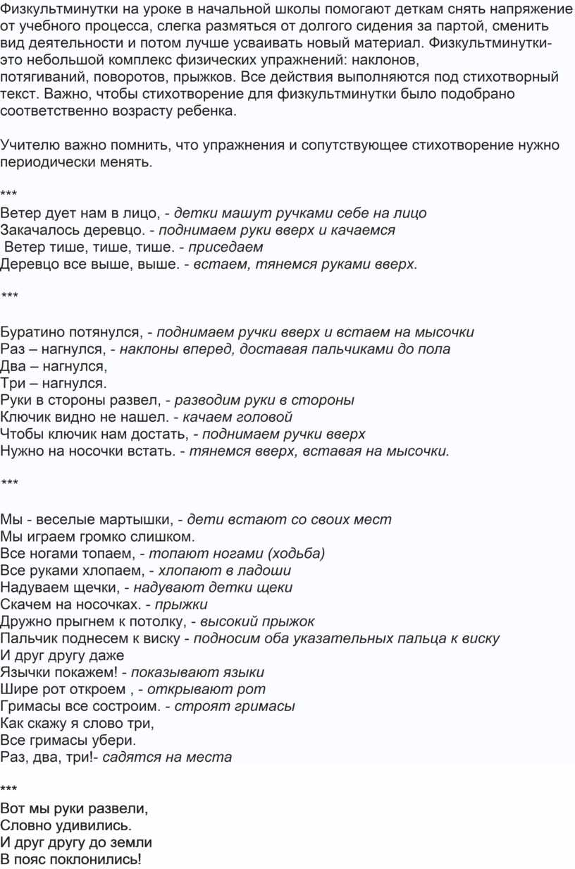 Физкультминутки на уроке в начальной школы помогают деткам снять напряжение от учебного процесса, слегка размяться от долгого сидения за партой, сменить вид деятельности и потом лучше усваивать новый материал. Физкультминутки- это небольшой комплекс физических упражнений: наклонов, потягиваний, поворотов, прыжков. Все действия выполняются под стихотворный текст. Важно, чтобы стихотворение для физкультминутки было подобрано соответственно возрасту ребенка.