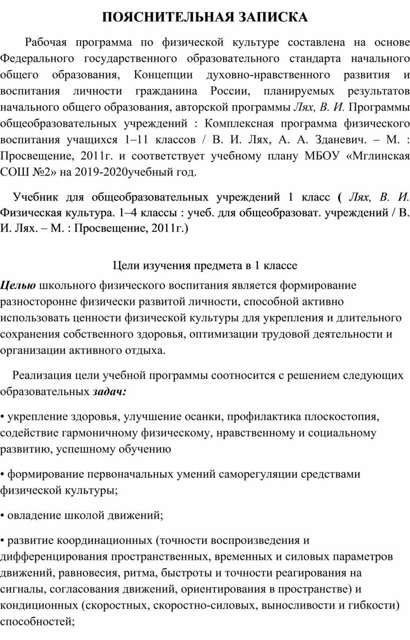 Рабочая программа по физической культуре составлена на основе Федерального государственного образовательного стандарта начального общего образования, Концепции духовно-нравственного развития и воспитания личности гражданина России, планируемых результатов начального общего образования, авторской программы Лях, В. И. Программы общеобразовательных учреждений : Комплексная программа физического воспитания учащихся 1–11 классов / В. И. Лях, А. А. Зданевич. – М. : Просвещение, 2011г. и соответствует учебному плану МБОУ «Мглинская СОШ №2» на 2019-2020учебный год.