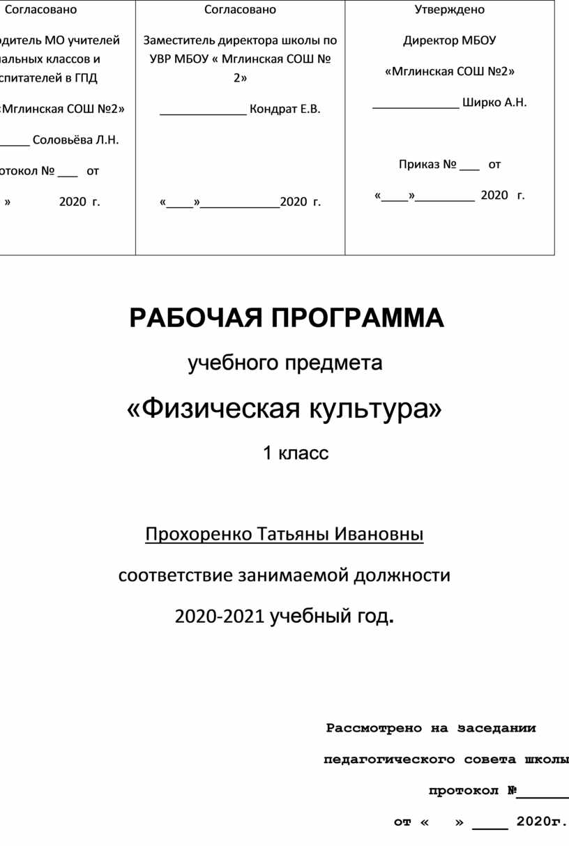 Согласовано Руководитель МО учителей начальных классов и воспитателей в ГПД МБОУ «Мглинская СОШ №2» __________ Соловьёва Л.Н. Протокол № ___ от « » 2020 г.