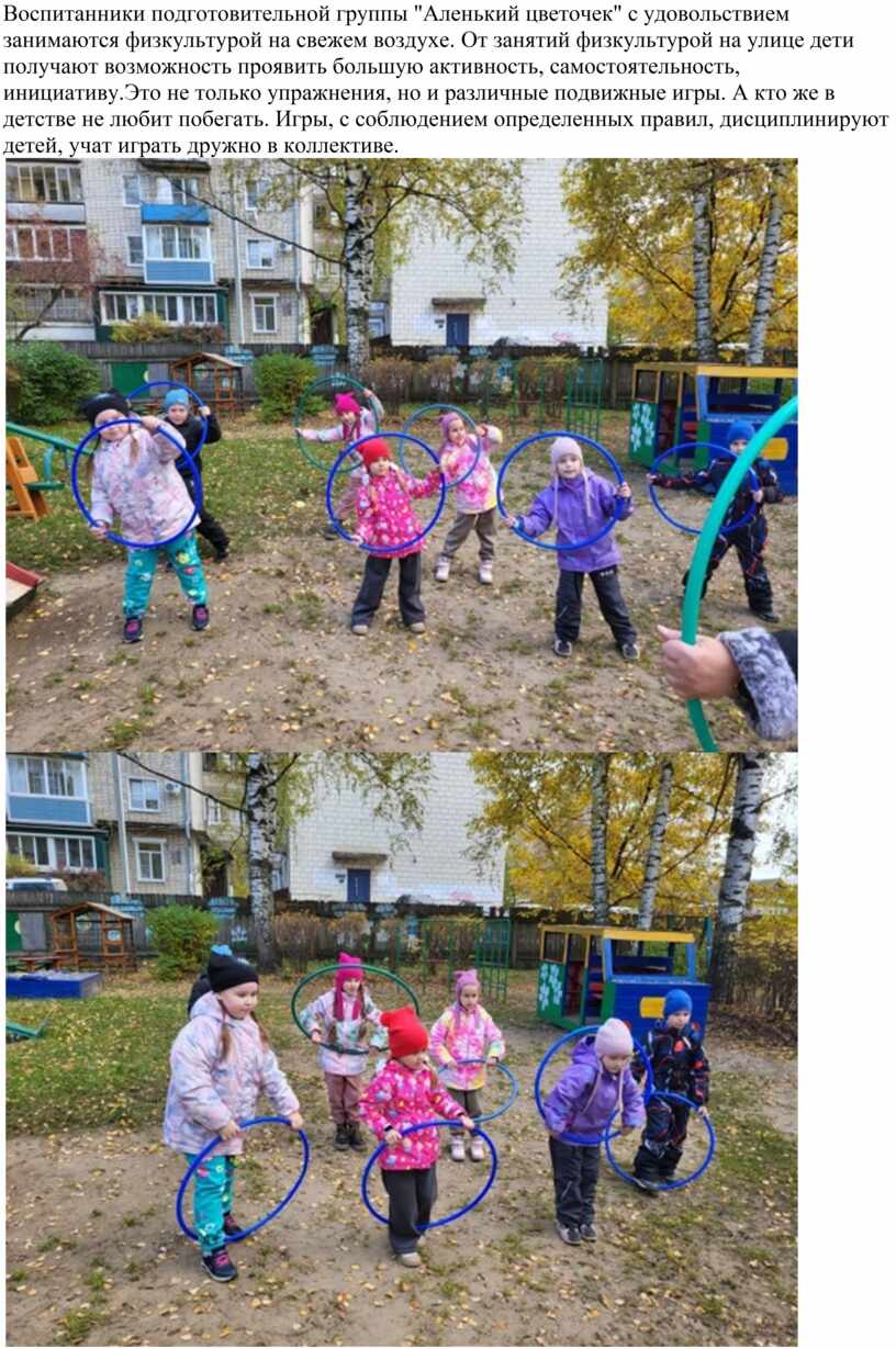 Воспитанники подготовительной группы "Аленький цветочек" с удовольствием занимаются физкультурой на свежем воздухе. От занятий физкультурой на улице дети получают возможность проявить большую активность, самостоятельность, инициативу.Это не только упражнения, но и различные подвижные игры. А кто же в детстве не любит побегать. Игры, с соблюдением определенных правил, дисциплинируют детей, учат играть дружно в коллективе.