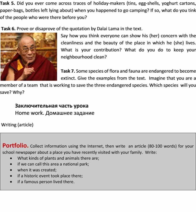 Portfolio. Collect information using the Internet, then write an article (80-100 words) for your school newspaper about a place you have recently visited with your family. Write: · What kinds of plants and animals there are; · if we can call this area a national park; · when it was created; · if a historic event took place there; · if a famous person lived there.