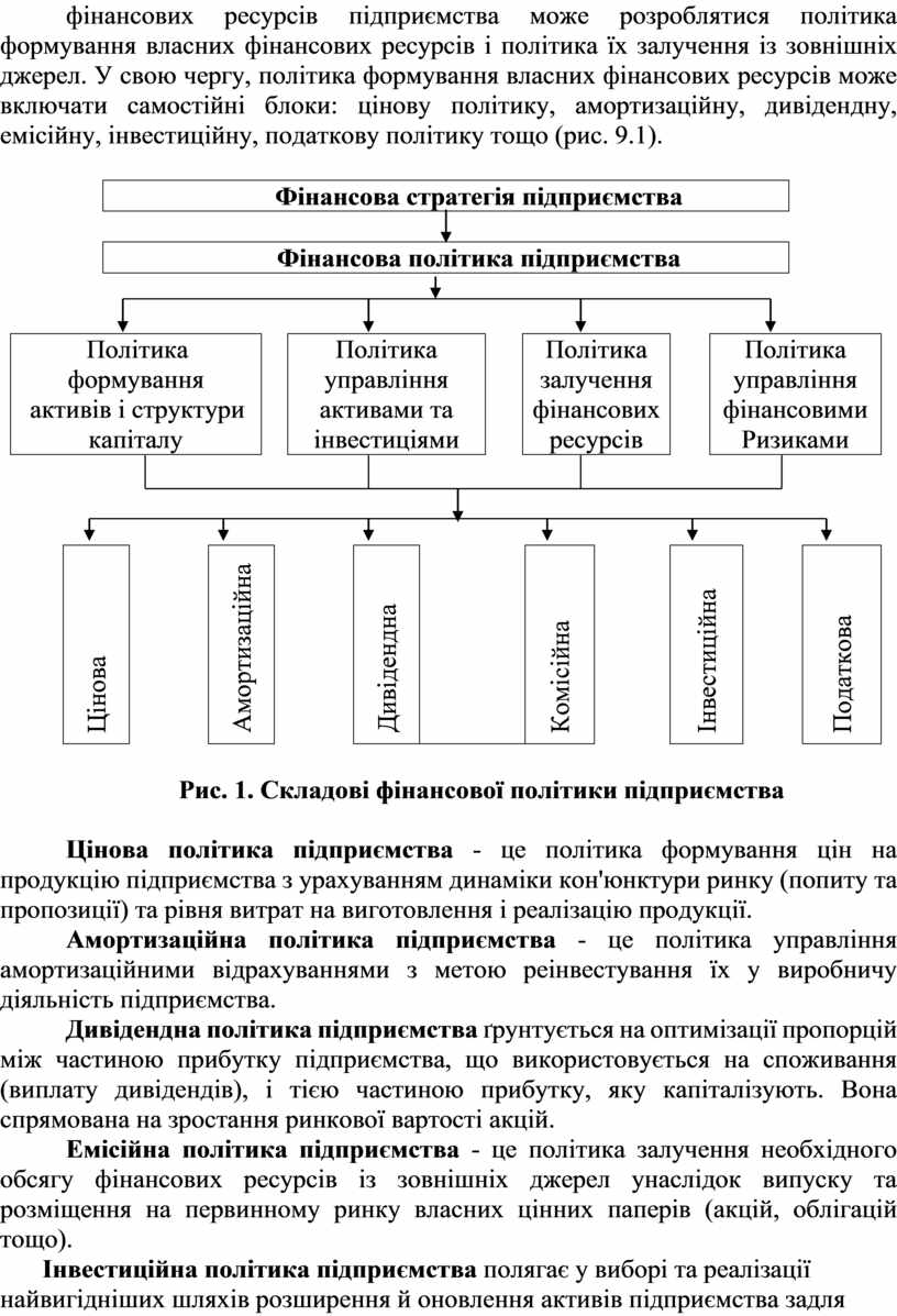 Формування фінансової політики підприємства має здебільшого багаторівневий характер. Так, наприклад, у межах політики формування фінансових ресурсів підприємства може розроблятися політика формування власних фінансових ресурсів і політика їх залучення із зовнішніх джерел. У свою чергу, політика формування власних фінансових ресурсів може включати самостійні блоки: цінову політику, амортизаційну, дивідендну, емісійну, інвестиційну, податкову політику тощо (рис. 9.1).
