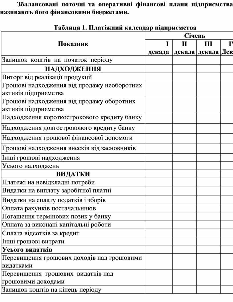 Платіжний календар - це оперативний фінансовий план, який зазвичай розробляють на місяць із розбивкою на декади або тижні. У ньому визначають очікувані грошові потоки (у національній та іноземній валютах) за всіма напрямками і термінами їх надходження і використання, а також порівнюють залишки грошових коштів, їх надходження і вибуття та оцінюють спроможність підприємства своєчасно виконувати всі свої поточні фінансові зобов'язання.