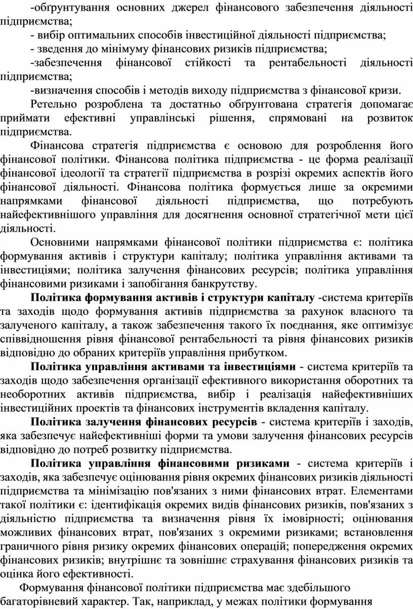 Фінансова стратегія підприємства є основою для розроблення його фінансової політики. Фінансова політика підприємства - це форма реалізації фінансової ідеології та стратегії підприємства в розрізі окремих аспектів його фінансової діяльності. Фінансова політика формується лише за окремими напрямками фінансової діяльності підприємства, що потребують найефективнішого управління для досягнення основної стратегічної мети цієї діяльності.