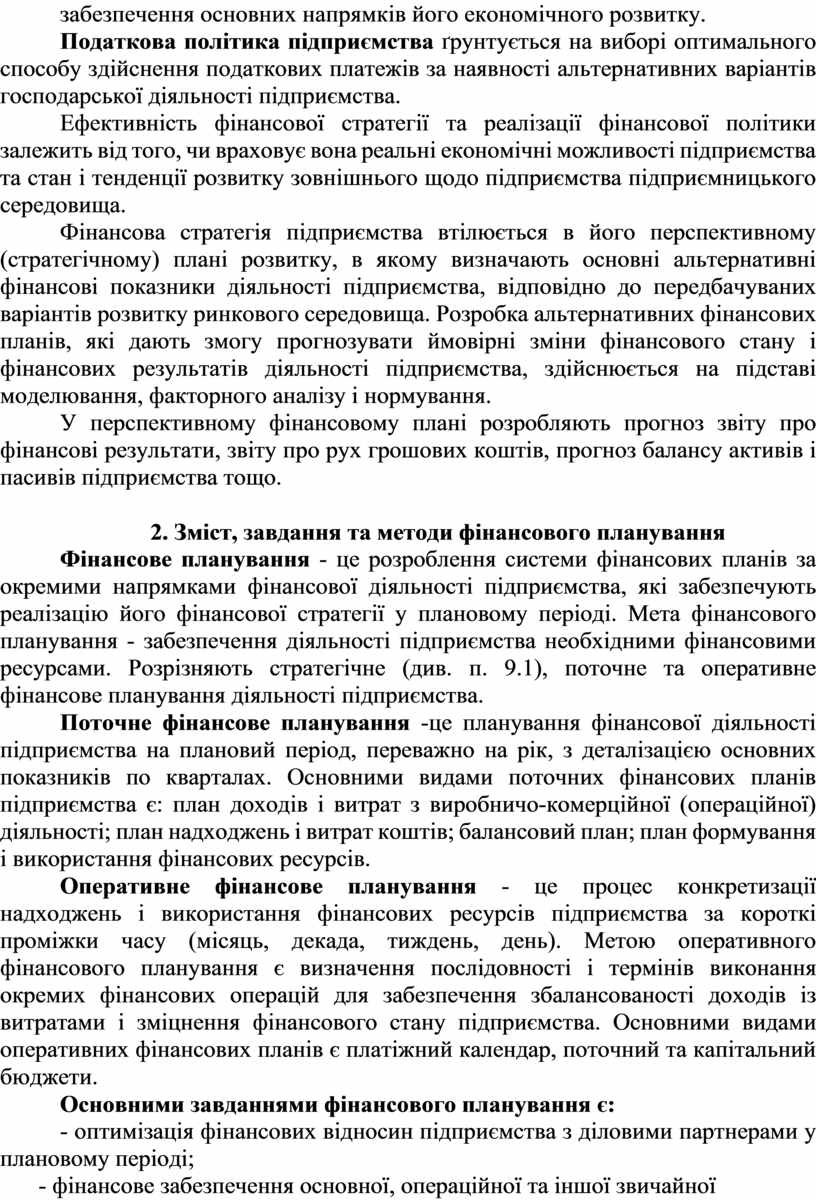 Фінансове планування - це розроблення системи фінансових планів за окремими напрямками фінансової діяльності підприємства, які забезпечують реалізацію його фінансової стратегії у плановому періоді. Мета фінансового планування - забезпечення діяльності підприємства необхідними фінансовими ресурсами. Розрізняють стратегічне (див. п. 9.1), поточне та оперативне фінансове планування діяльності підприємства.