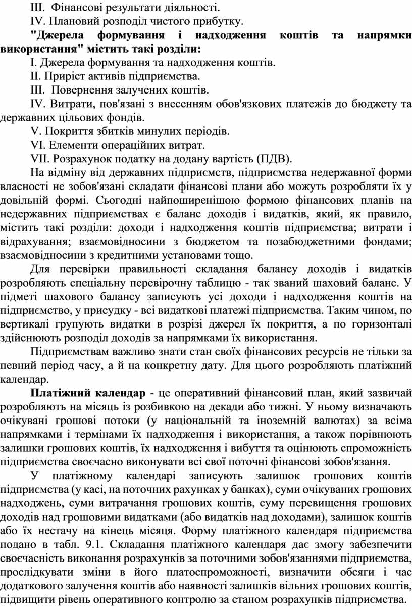 У платіжному календарі записують залишок грошових коштів підприємства (у касі, на поточних рахунках у банках), суми очікуваних грошових надходжень, суми витрачання грошових коштів, суму перевищення грошових доходів над грошовими видатками (або видатків над доходами), залишок коштів або їх нестачу на кінець місяця. Форму платіжного календаря підприємства подано в табл. 9.1. Складання платіжного календаря дає змогу забезпечити своєчасність виконання розрахунків за поточними зобов'язаннями підприємства, прослідкувати зміни в його платоспроможності, визначити обсяги і час додаткового залучення коштів або наявності залишків вільних грошових коштів, підвищити рівень оперативного контролю за станом розрахунків підприємства.