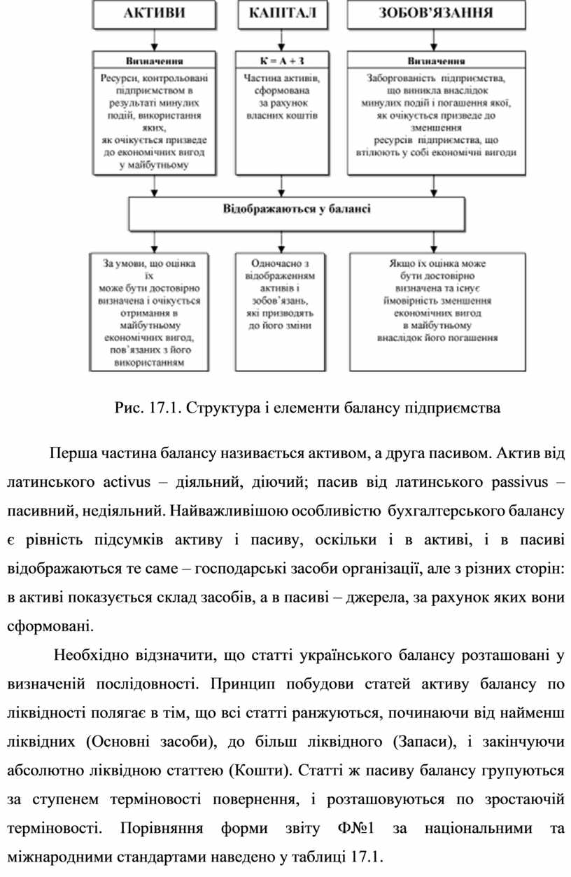 Необхідно відзначити, що статті українського балансу розташовані у визначеній послідовності. Принцип побудови статей активу балансу по ліквідності полягає в тім, що всі статті ранжуються, починаючи від найменш ліквідних (Основні засоби), до більш ліквідного (Запаси), і закінчуючи абсолютно ліквідною статтею (Кошти). Статті ж пасиву балансу групуються за ступенем терміновості повернення, і розташовуються по зростаючій терміновості. Порівняння форми звіту Ф№1 за національними та міжнародними стандартами наведено у таблиці 17.1.