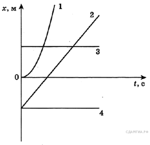 14. На рисунке представлен график зависимости координаты x от времени t для четырёх тел, движущихся вдоль оси Ox. Равномерному движению соответствует график