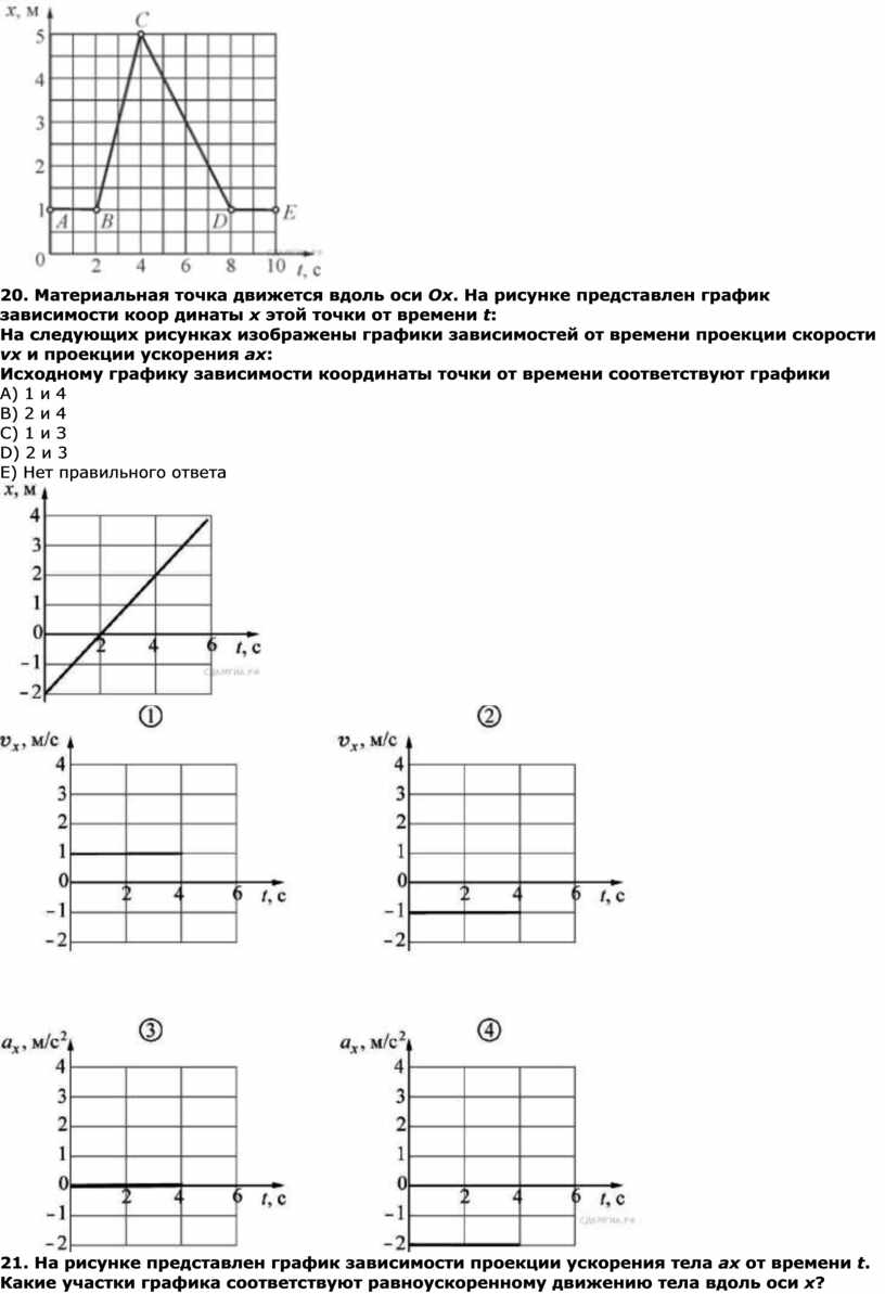 19. На рисунке представлен график зависимости проекции скорости тела vx от времени t. Равноускоренному движению тела вдоль оси Ox с отличным от нуля ускорением соответствует