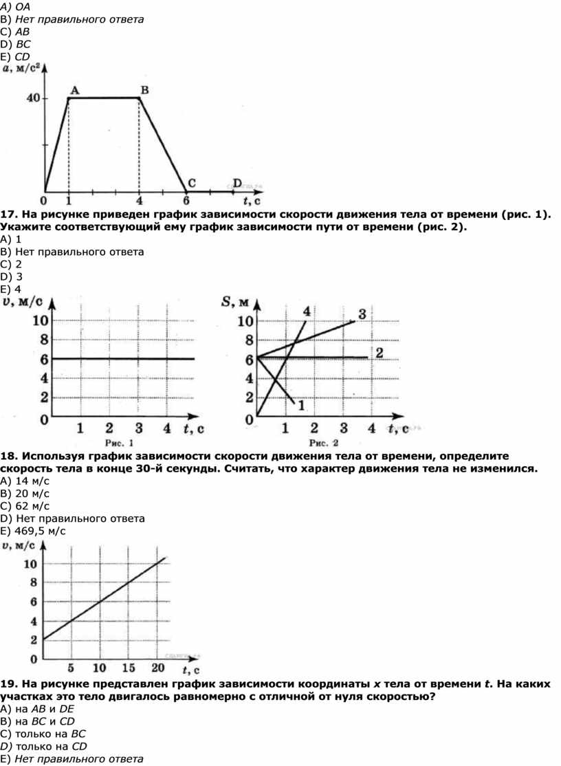 17. На рисунке приведен график зависимости скорости движения тела от времени (рис. 1). Укажите соответствующий ему график зависимости пути от времени (рис. 2).