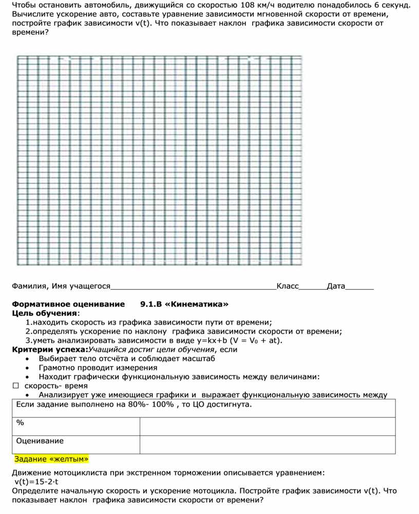 Чтобы остановить автомобиль, движущийся со скоростью 108 км/ч водителю понадобилось 6 секунд. Вычислите ускорение авто, составьте уравнение зависимости мгновенной скорости от времени, постройте график зависимости v(t). Что показывает наклон графика зависимости скорости от времени?