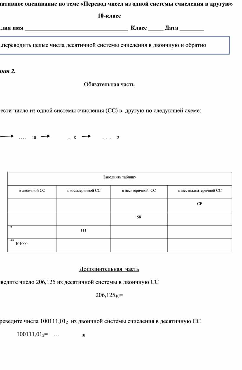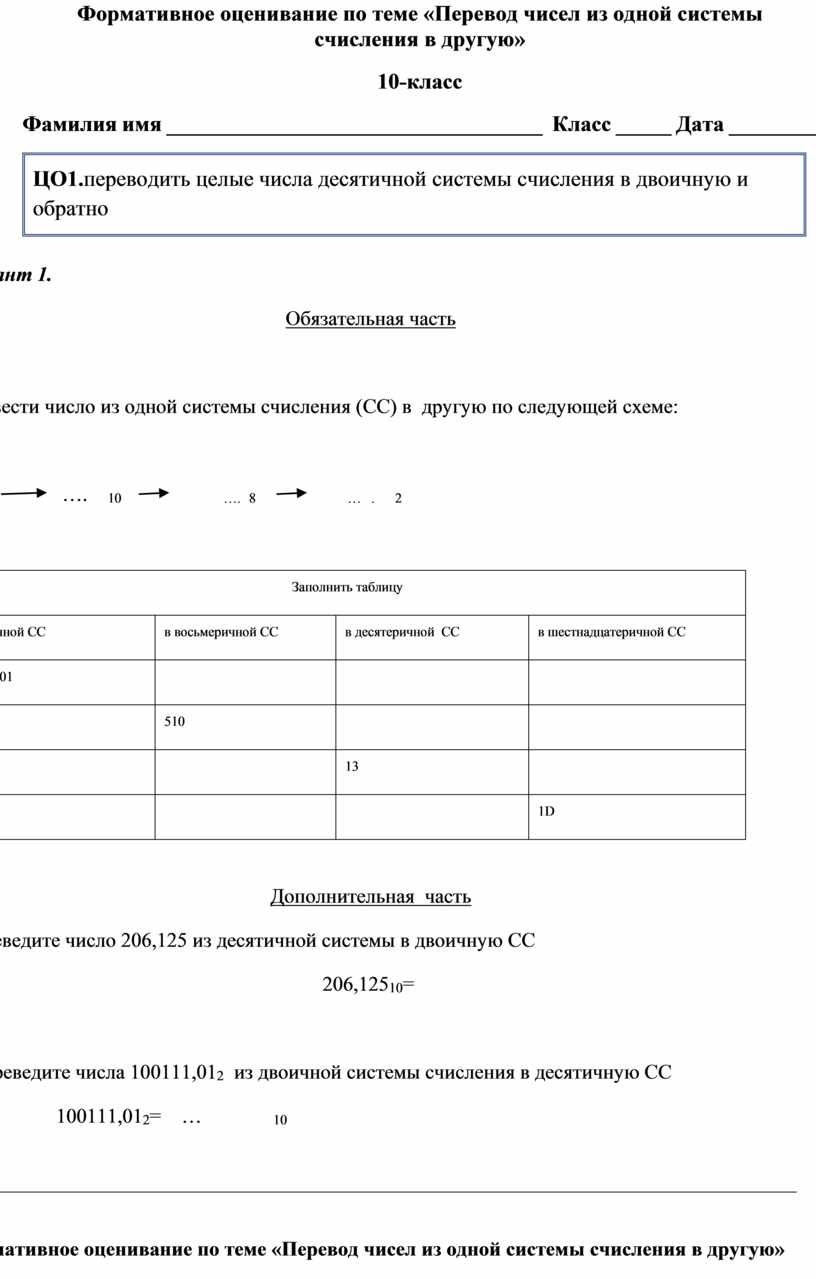 Формативное оценивание по теме «Перевод чисел из одной системы счисления в другую» 10-класс Фамилия имя __________________________________ Класс _____ Дата ________