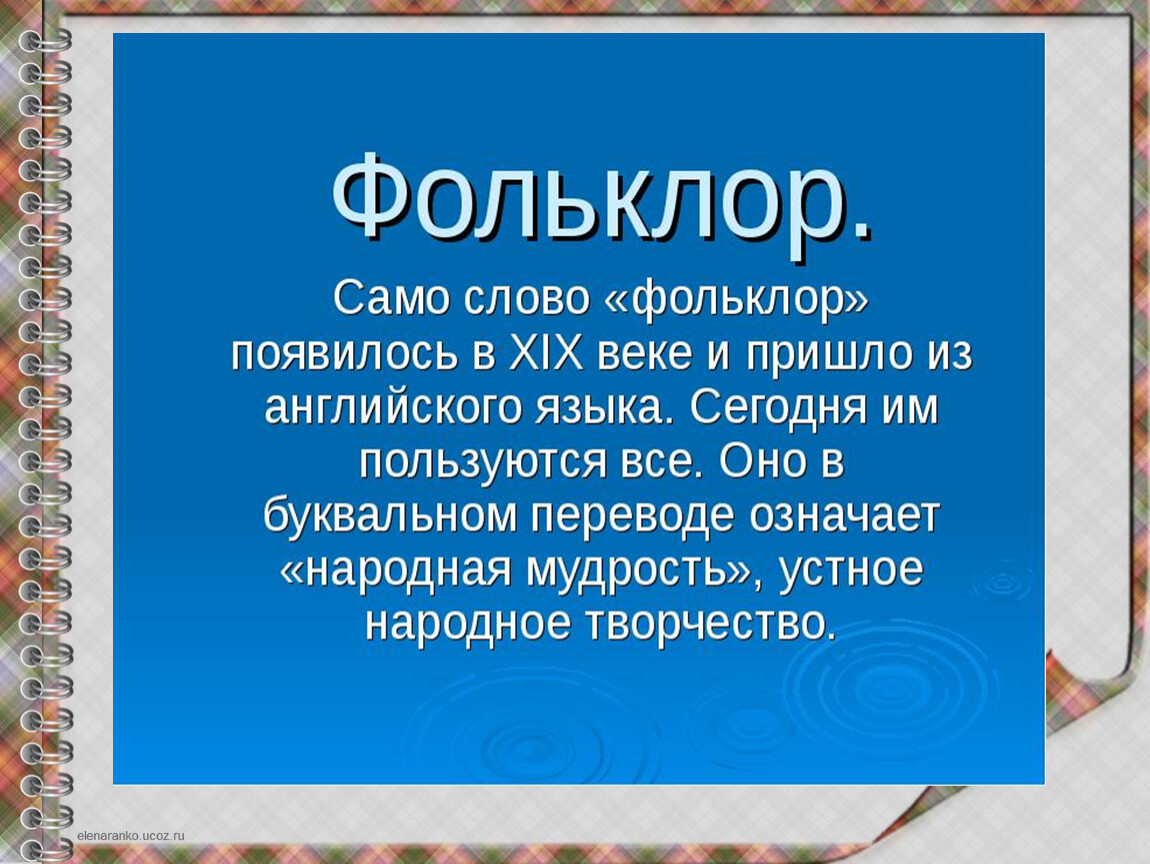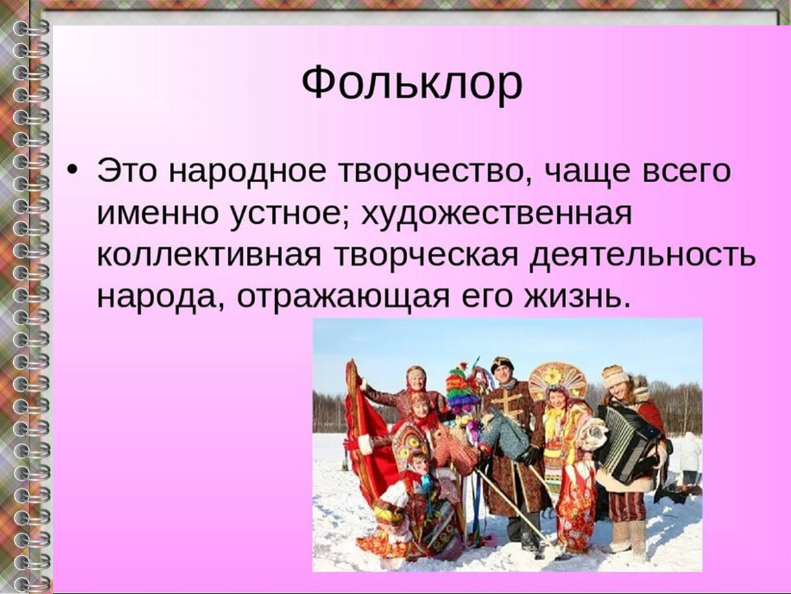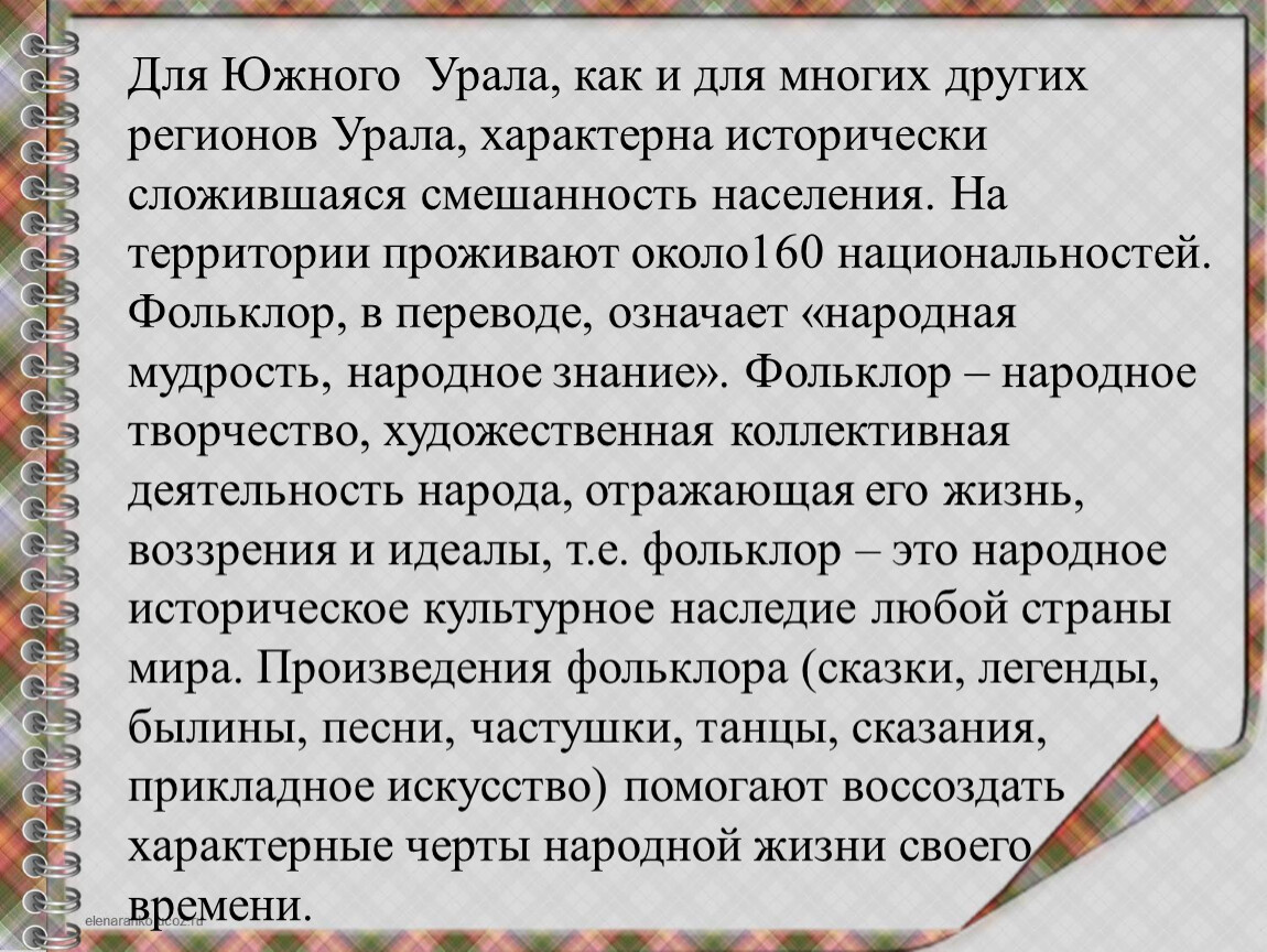 Для Южного Урала, как и для многих других регионов Урала, характерна исторически сложившаяся смешанность населения. На территории проживают около160 национальностей.Фольклор, в переводе, означает «народная мудрость, народное знание». Фольклор – народное творчество, художественная коллективная деятельность народа, отражающая его жизнь, воззрения и идеалы, т.е. фольклор – это народное историческое культурное наследие любой страны мира. Произведения фольклора (сказки, легенды, былины, песни, частушки, танцы, сказания, прикладное искусство) помогают воссоздать характерные черты народной жизни своего времени.