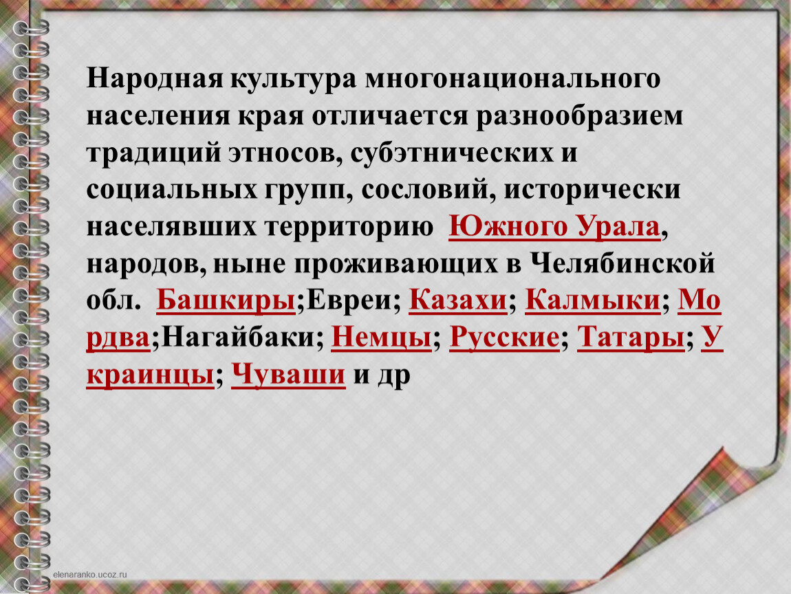 Народная культура многонационального населения края отличается разнообразием традиций этносов, субэтнических и социальных групп, сословий, исторически населявших территорию Южного Урала, народов, ныне проживающих в Челябинской обл. Башкиры;Евреи; Казахи; Калмыки; Мордва;Нагайбаки; Немцы; Русские; Татары; Украинцы; Чуваши и др