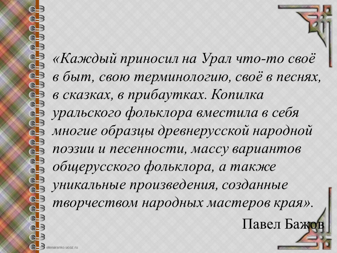 «Каждый приносил на Урал что-то своё в быт, свою терминологию, своё в песнях, в сказках, в прибаутках. Копилка уральского фольклора вместила в себя многие образцы древнерусской народной поэзии и песенности, массу вариантов общерусского фольклора, а также уникальные произведения, созданные творчеством народных мастеров края».
