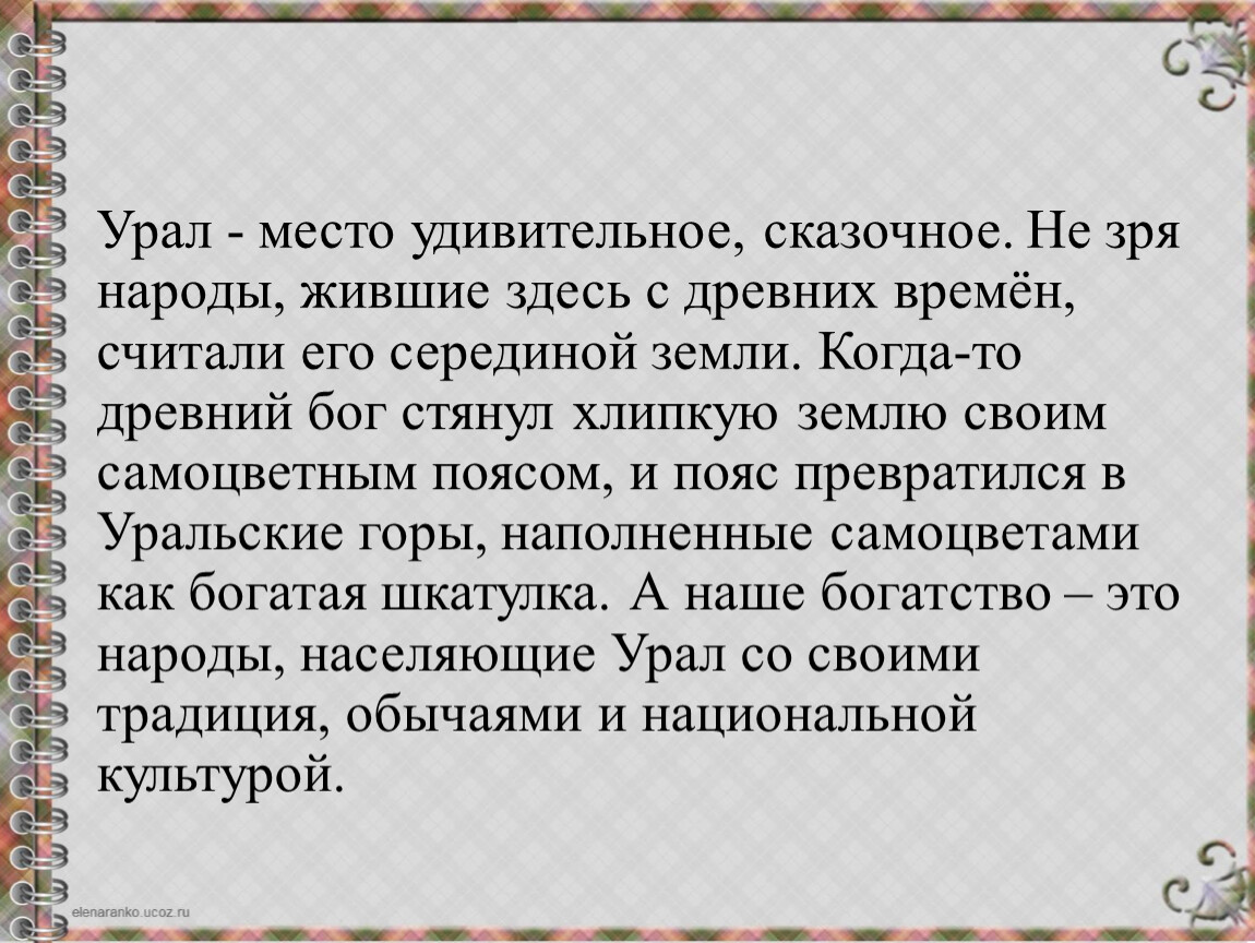 Урал - место удивительное, сказочное. Не зря народы, жившие здесь с древних времён, считали его серединой земли. Когда-то древний бог стянул хлипкую землю своим самоцветным поясом, и пояс превратился в Уральские горы, наполненные самоцветами как богатая шкатулка. А наше богатство – это народы, населяющие Урал со своими традиция, обычаями и национальной культурой.