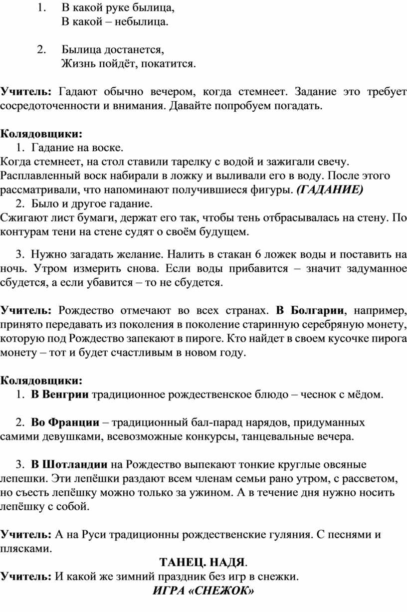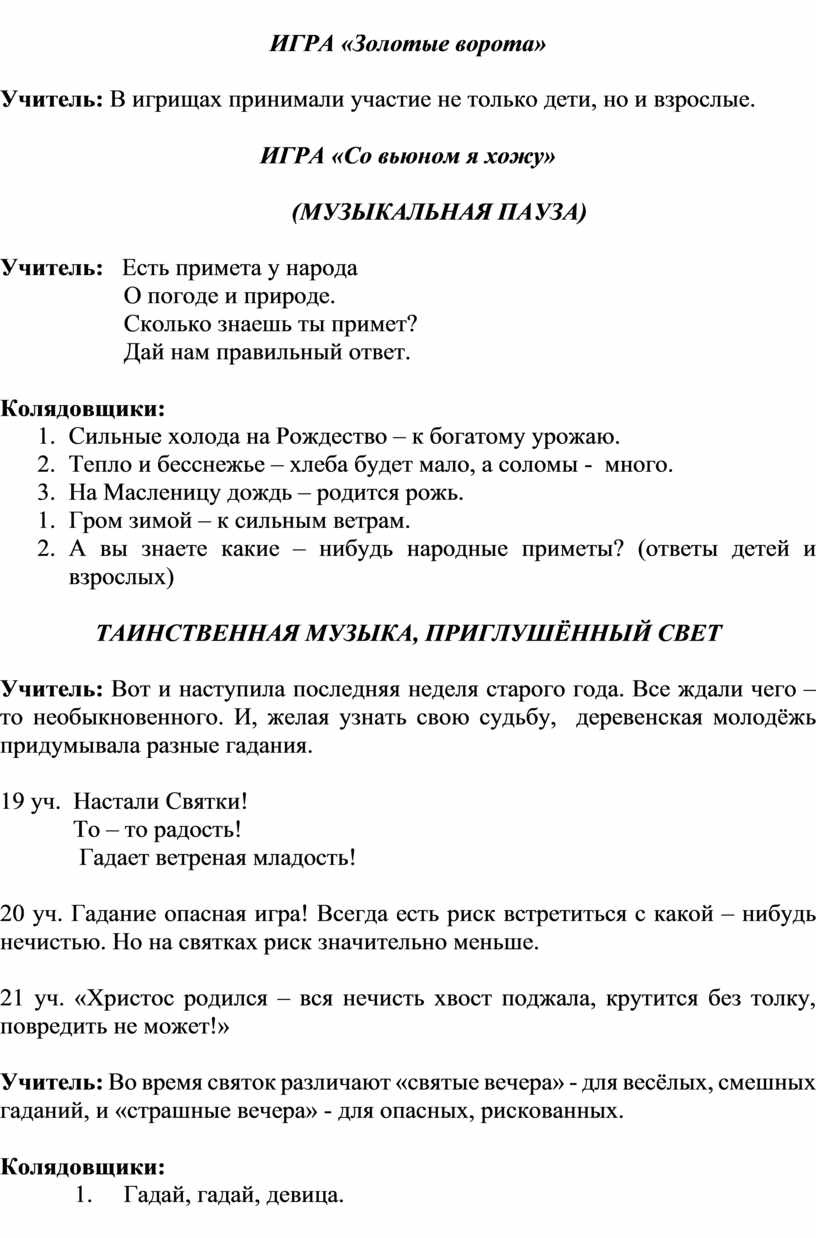 Учитель: Вот и наступила последняя неделя старого года. Все ждали чего – то необыкновенного. И, желая узнать свою судьбу, деревенская молодёжь придумывала разные гадания.