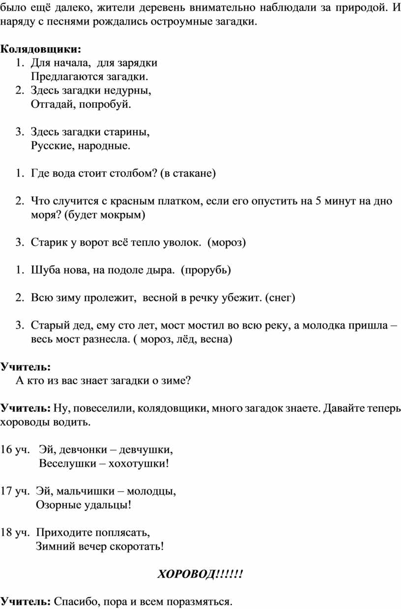 Учитель: А невидимая коляда проходила по деревням, и земледельцы надеялись, что она принесёт хорошую весну, обильный урожай. Но до весны было ещё далеко, жители деревень внимательно наблюдали за природой. И наряду с песнями рождались остроумные загадки.