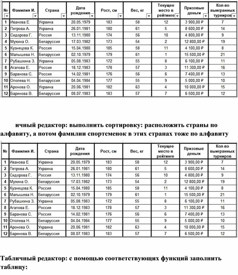 ичный редактор: выполнить сортировку: расположить страны по алфавиту, а потом фамилии спортсменок в этих странах тоже по алфавиту