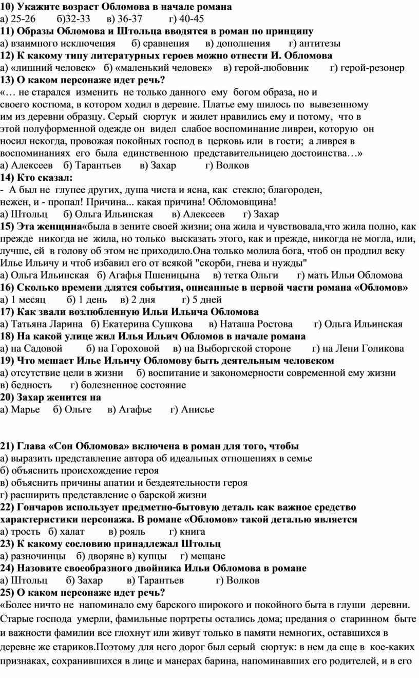 Тестовые задания по роману И.А.Гончарова