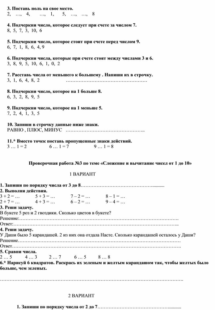 Проверочная работа №3 по теме «Сложение и вычитание чисел от 1 до 10»