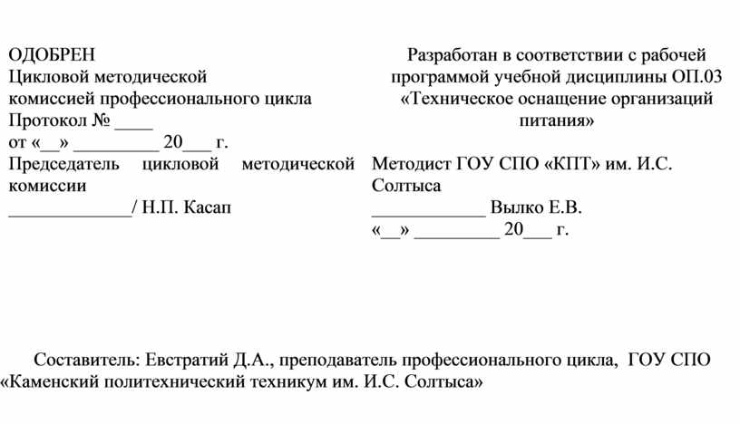 Разработан в соответствии с рабочей программой учебной дисциплины ОП.03 «Техническое оснащение организаций питания»