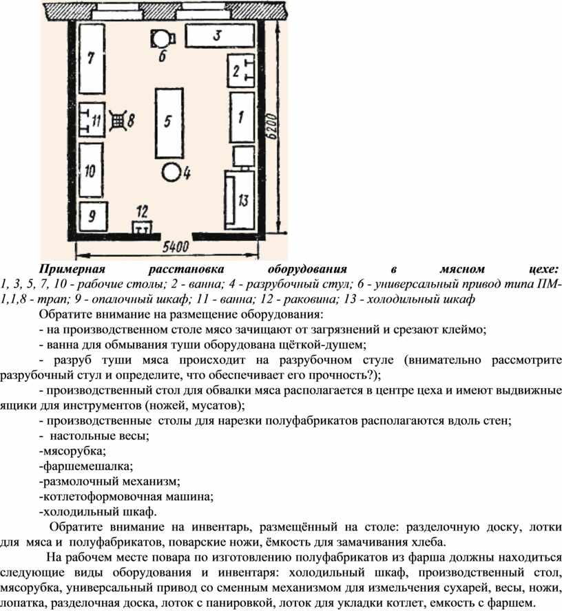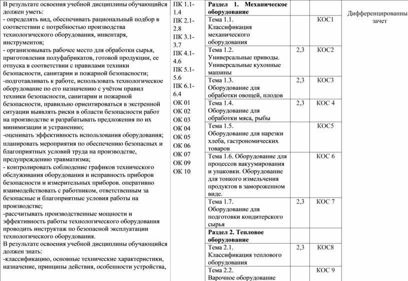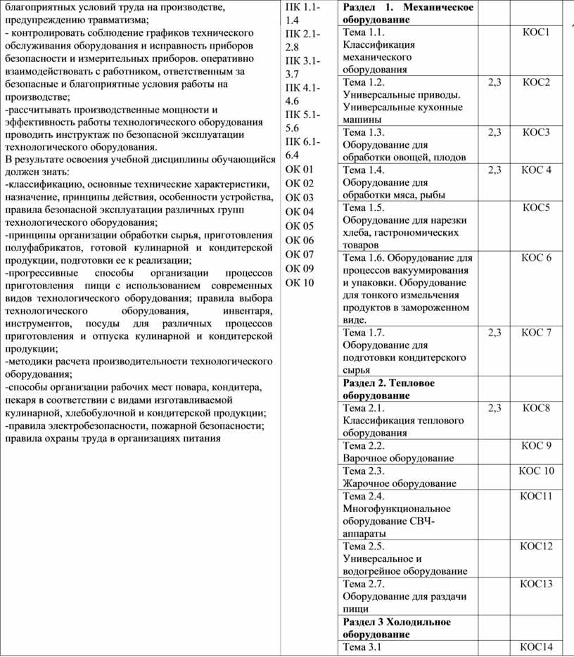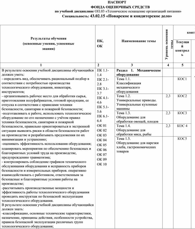 В результате освоения учебной дисциплины обучающийся должен уметь: - определять вид, обеспечивать рациональный подбор в соответствии с потребностью производства технологического оборудования, инвентаря, инструментов; - организовывать рабочее место для обработки сырья, приготовления полуфабрикатов, готовой продукции, ее отпуска в соответствии с правилами техники безопасности, санитарии и пожарной безопасности; -подготавливать к работе, использовать технологическое оборудование по его назначению с учётом правил техники безопасности, санитарии и пожарной безопасности, правильно ориентироваться в экстренной ситуации выявлять риски в области безопасности работ на производстве и разрабатывать предложения по их минимизации и устранению; -оценивать эффективность использования оборудования; планировать мероприятия по обеспечению безопасных и благоприятных условий труда на производстве, предупреждению травматизма; - контролировать соблюдение графиков технического обслуживания оборудования и исправность приборов безопасности и измерительных приборов. оперативно взаимодействовать с работником, ответственным за безопасные и благоприятные условия работы на производстве; -рассчитывать производственные мощности и эффективность работы технологического оборудования проводить инструктаж по безопасной эксплуатации технологического оборудования. В результате освоения учебной дисциплины обучающийся должен знать: -классификацию, основные технические характеристики, назначение, принципы действия, особенности устройства, правила безопасной эксплуатации различных групп технологического оборудования; -принципы организации обработки сырья, приготовления полуфабрикатов, готовой кулинарной и кондитерской продукции, подготовки ее к реализации; -прогрессивные способы организации процессов приготовления пищи с использованием современных видов технологического оборудования; правила выбора технологического оборудования, инвентаря, инструментов, посуды для различных процессов приготовления и отпуска кулинарной и кондитерской продукции; -методики расчета производительности технологического оборудования; -способы организации рабочих мест повара, кондитера, пекаря в соответствии с видами изготавливаемой кулинарной, хлебобулочной и кондитерской продукции; -правила электробезопасности, пожарной безопасности; правила охраны труда в организациях питания