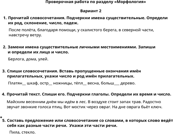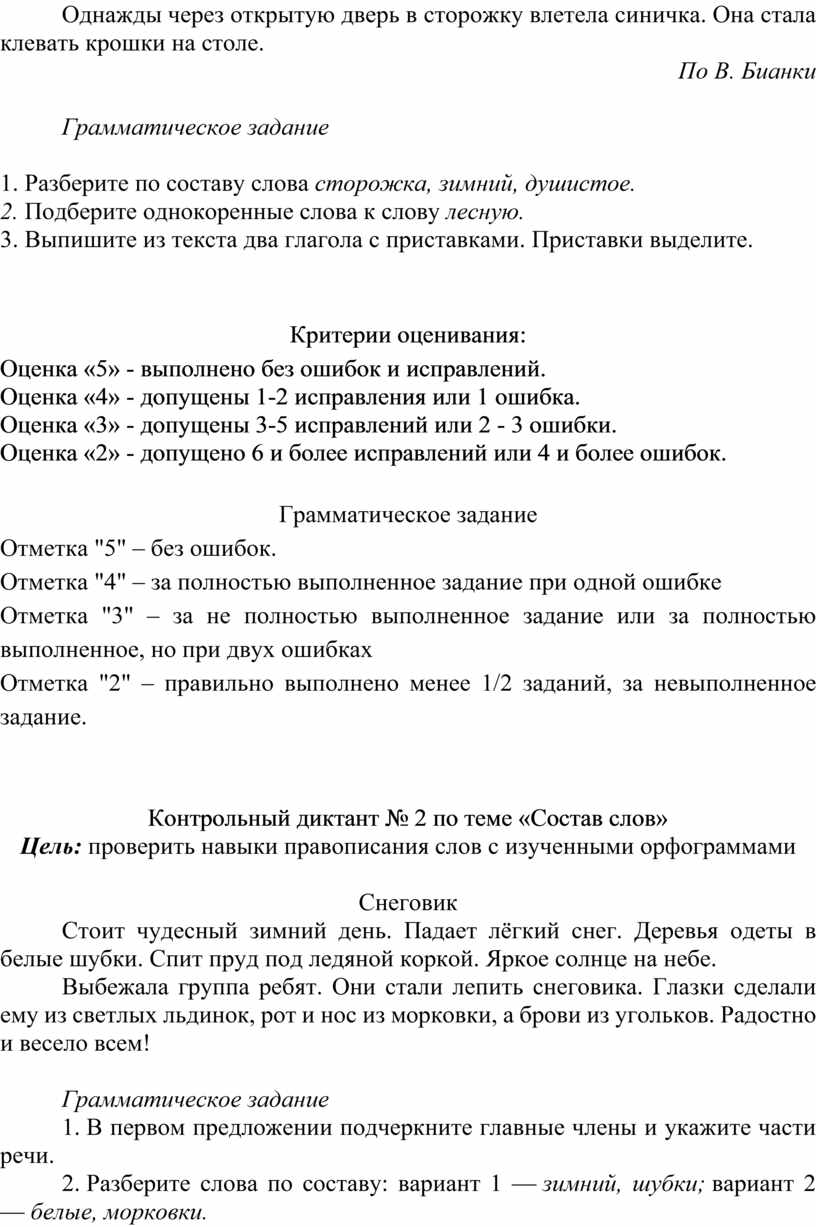 Для проверки степени понимания учащимися изучаемых грамматических явлений, умения производить простейший языковой анализ слов и предложений проводится выполнение грамматических заданий. Задания данного вида могут проводиться отдельно от контрольного диктанта и контрольного списывания или проводиться после диктанта (не более 4 видов грамматических разборов). В таком случае выставляются 2 отметки: за диктант и задание по отдельности.