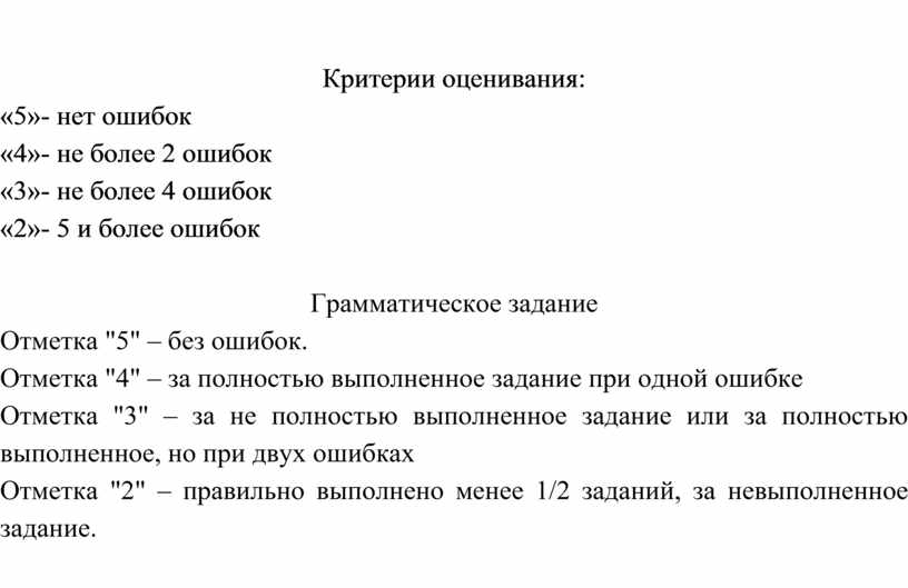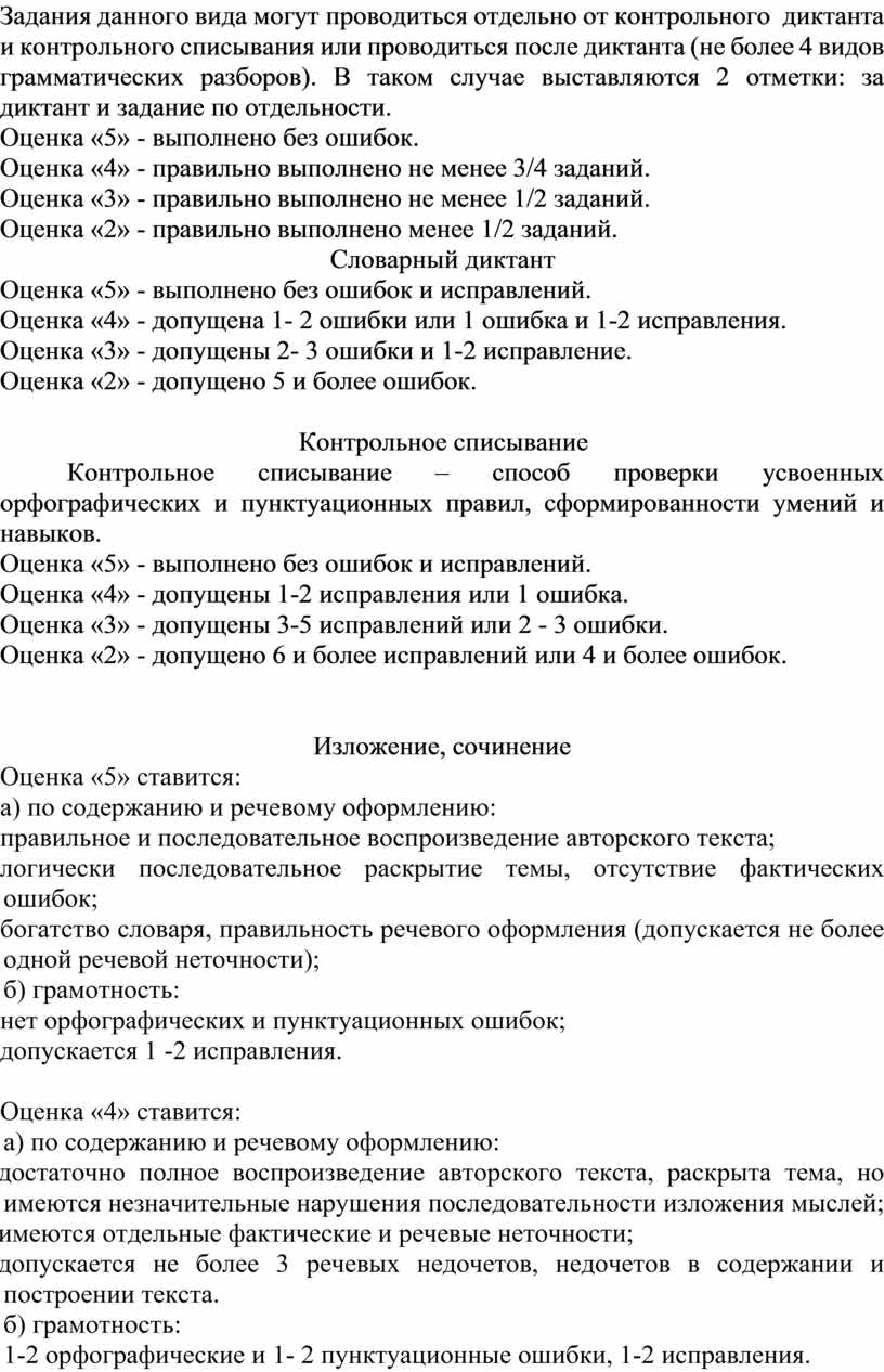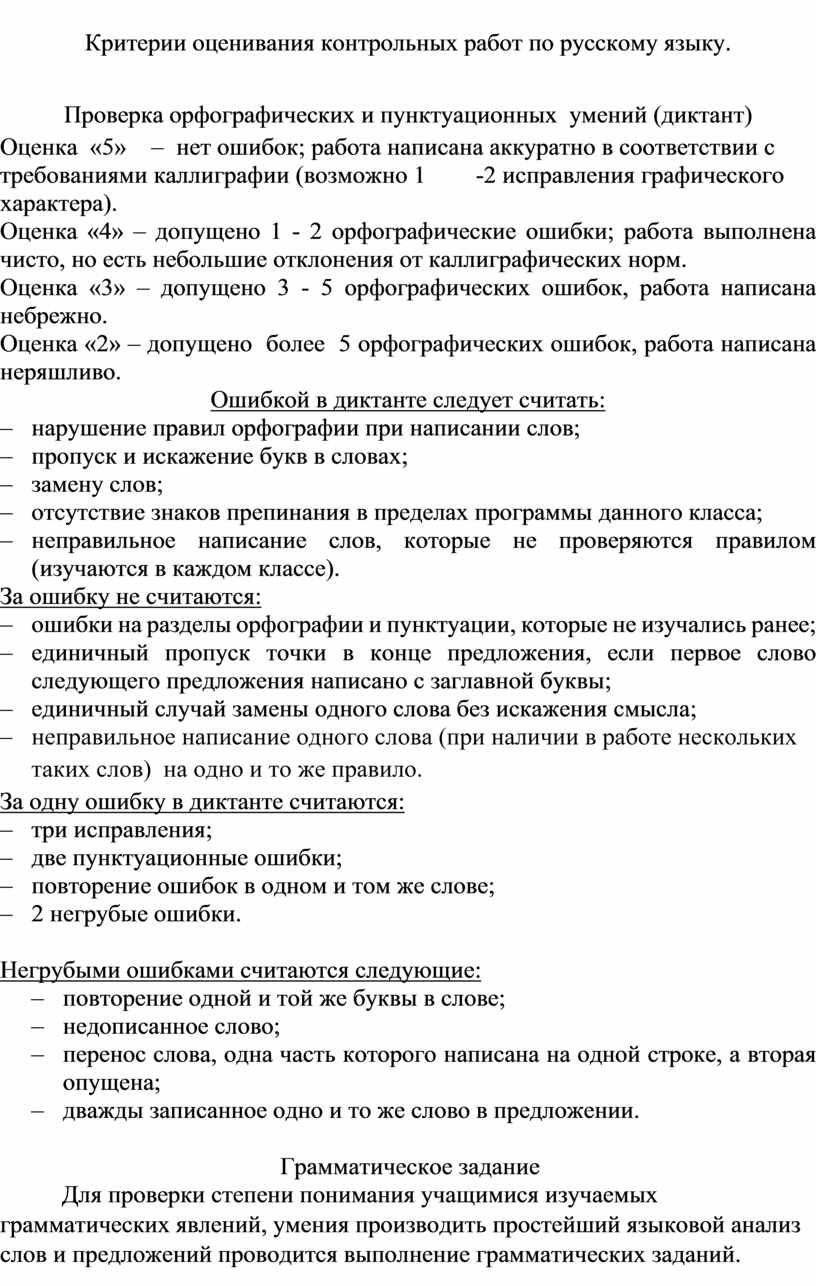 Критерии оценивания контрольных работ по русскому языку.