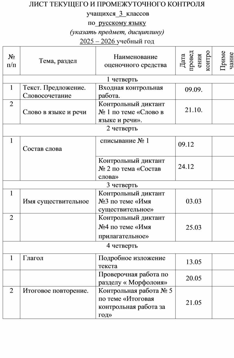 ЛИСТ ТЕКУЩЕГО И ПРОМЕЖУТОЧНОГО КОНТРОЛЯ