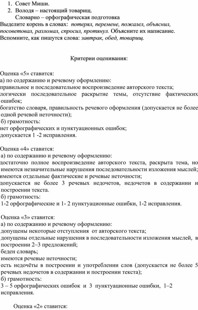 Оценка «4» – допущено 1 - 2 орфографические ошибки; работа выполнена чисто, но есть небольшие отклонения от каллиграфических норм.