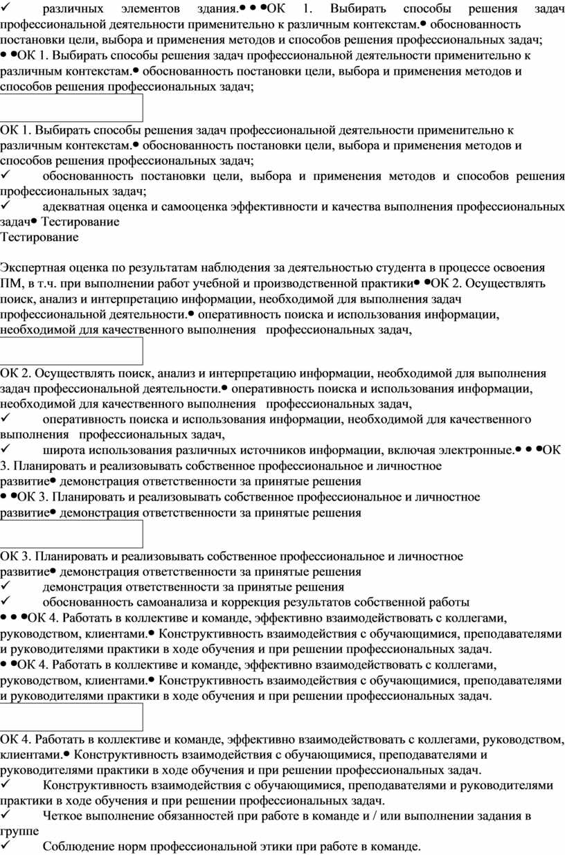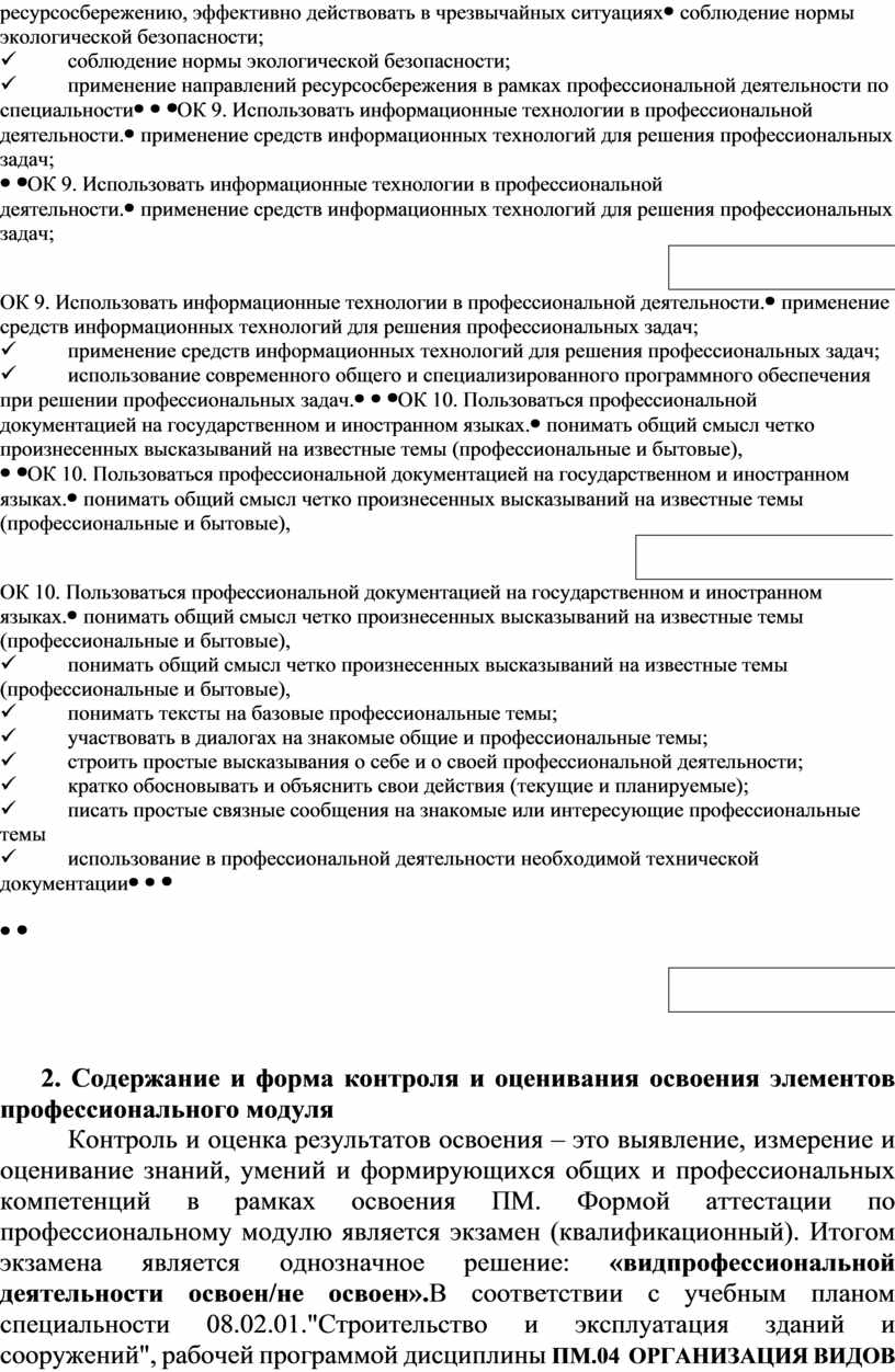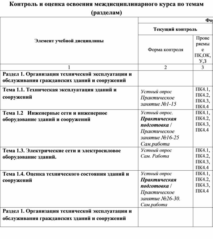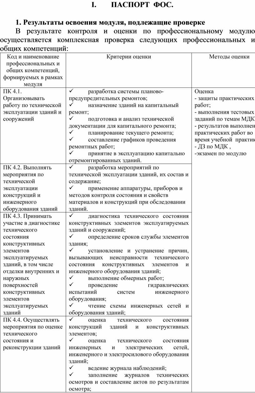 Контроль и оценка результатов освоения – это выявление, измерение и оценивание знаний, умений и формирующихся общих и профессиональных компетенций в рамках освоения ПМ. Формой аттестации по профессиональному модулю является экзамен (квалификационный). Итогом экзамена является однозначное решение: «видпрофессиональной деятельности освоен/не освоен».В соответствии с учебным планом специальности 08.02.01."Строительство и эксплуатация зданий и сооружений", рабочей программой дисциплины ПМ.04 Организация видов работ при эксплуатации иреконструкции строительных объектов, предусматривается текущий и промежуточный контроль результатов освоения: