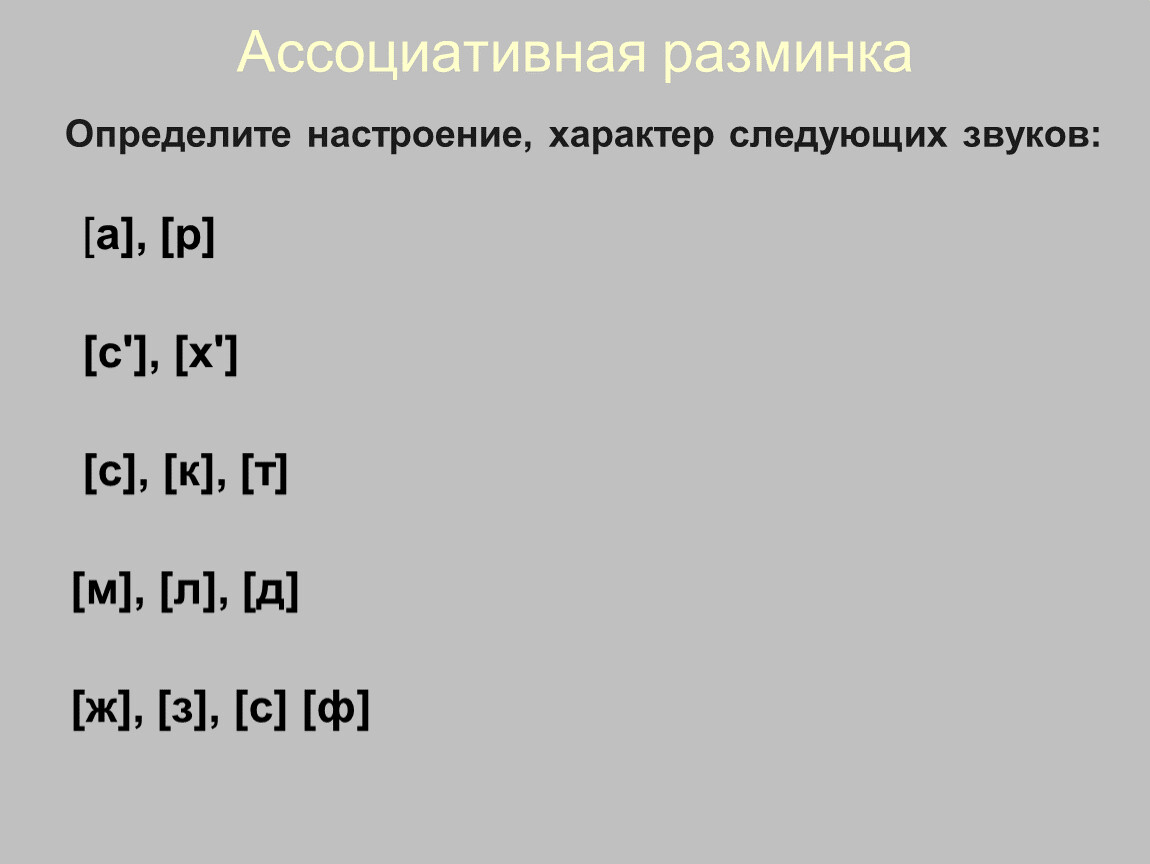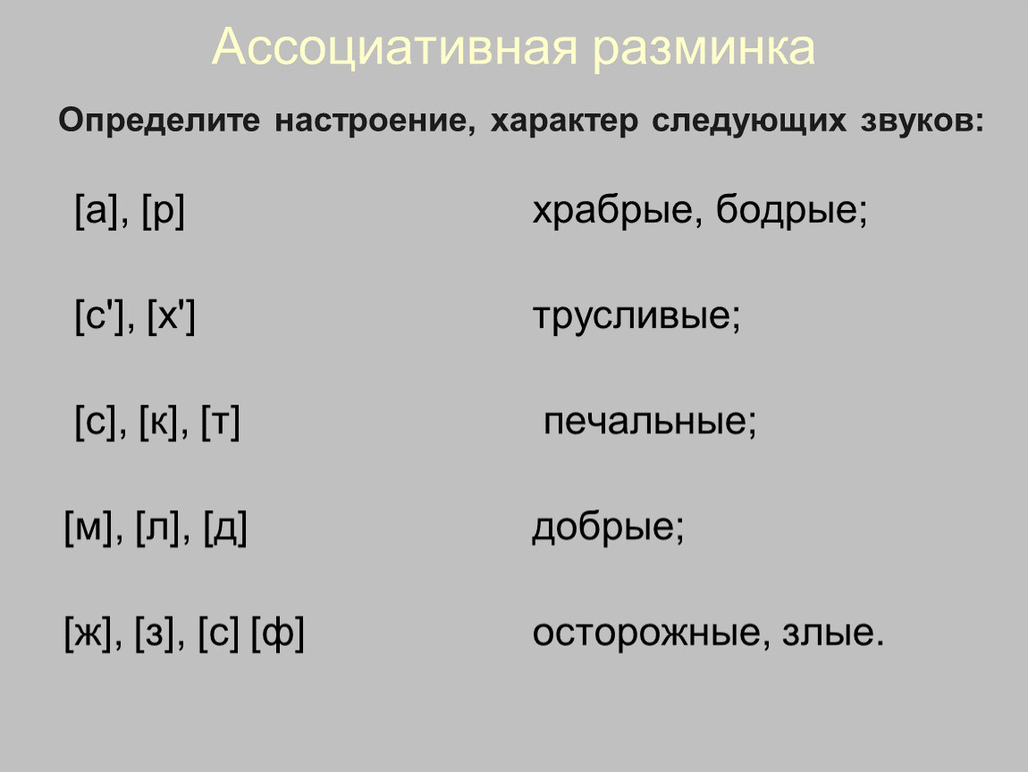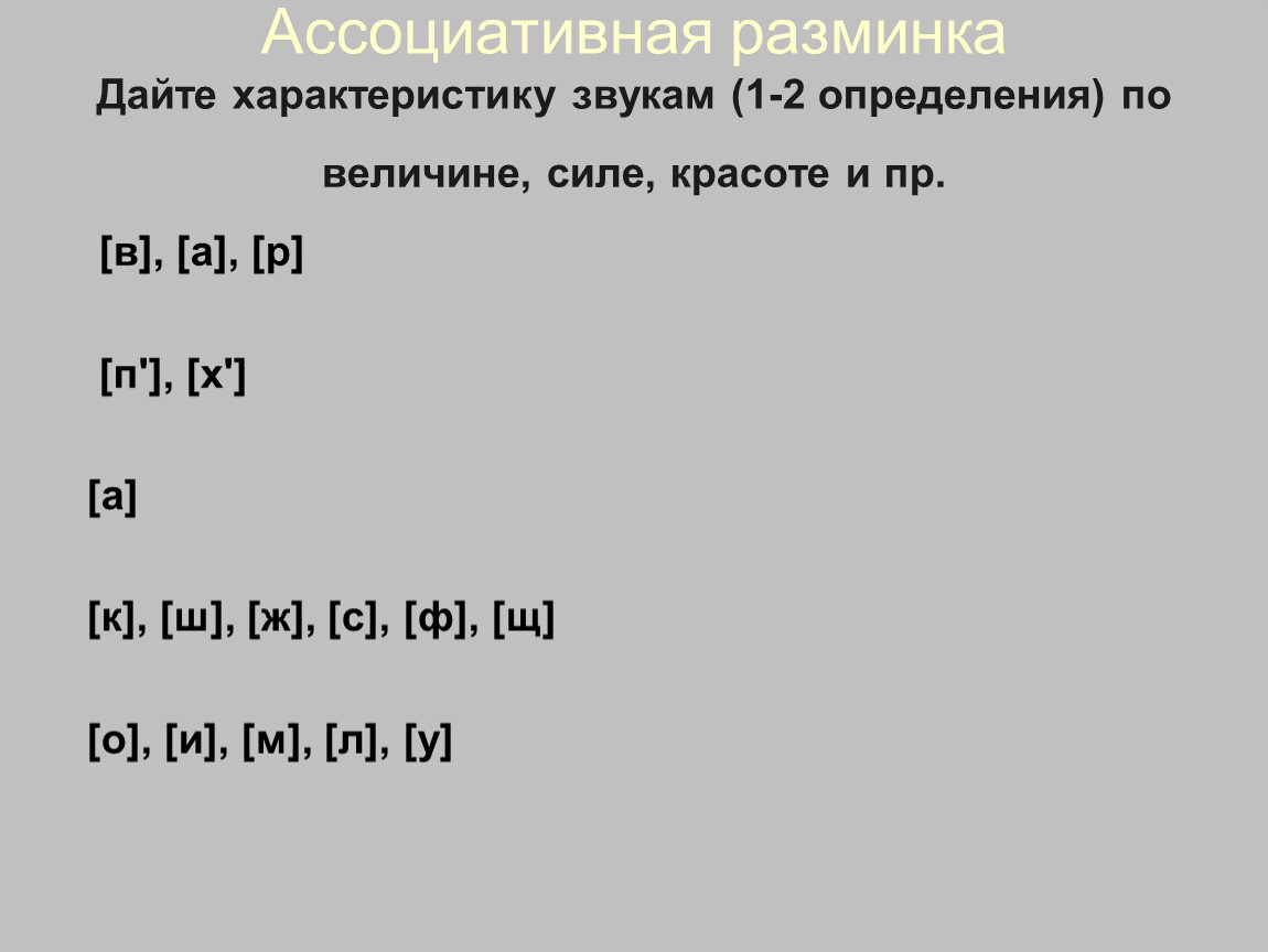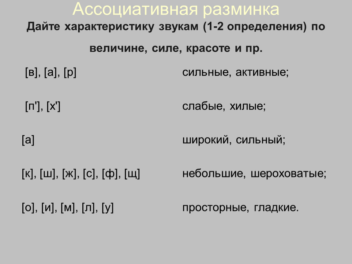 Ассоциативная разминкаДайте характеристику звукам (1-2 определения) по величине, силе, красоте и пр.