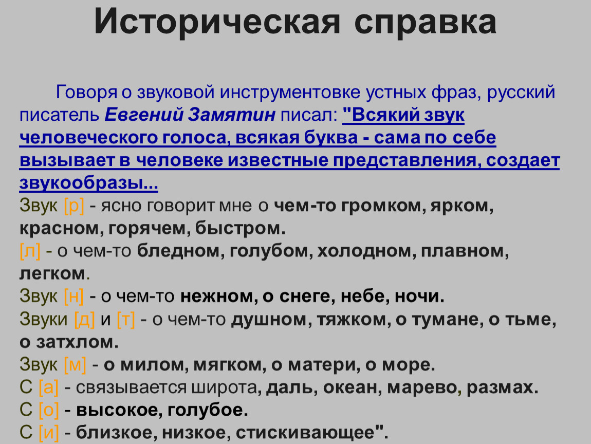 Говоря о звуковой инструментовке устных фраз, русский писатель Евгений Замятин писал: "Всякий звук человеческого голоса, всякая буква - сама по себе вызывает в человеке известные представления, создает звукообразы...