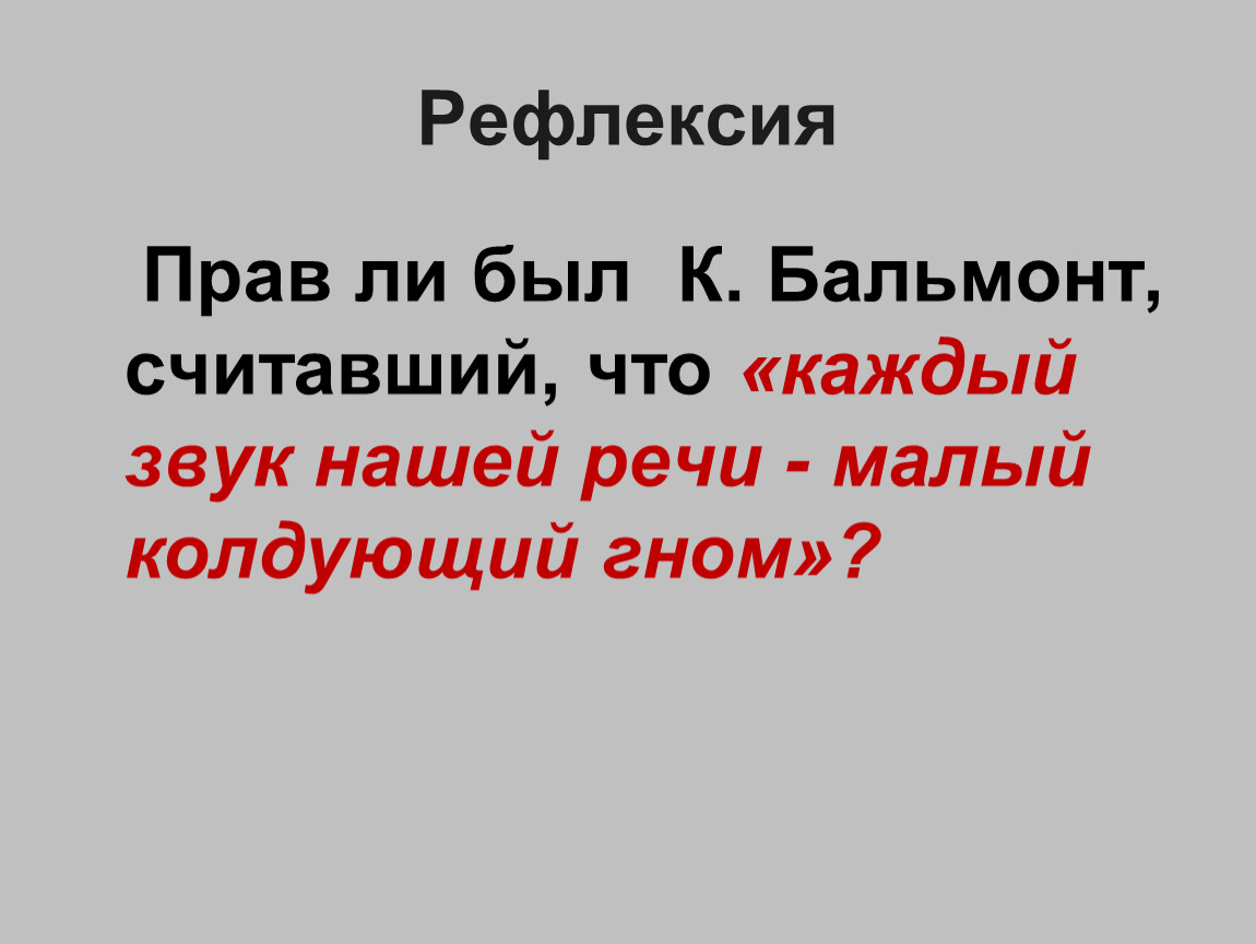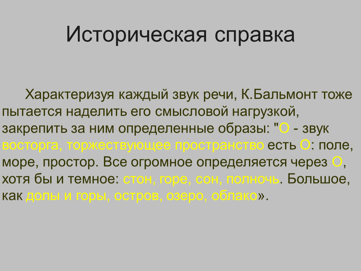 Характеризуя каждый звук речи, К.Бальмонт тоже пытается наделить его смысловой нагрузкой, закрепить за ним определенные образы: "О - звук восторга, торжествующее пространство есть О: поле, море, простор. Все огромное определяется через О, хотя бы и темное: стон, горе, сон, полночь. Большое, как долы и горы, остров, озеро, облако».