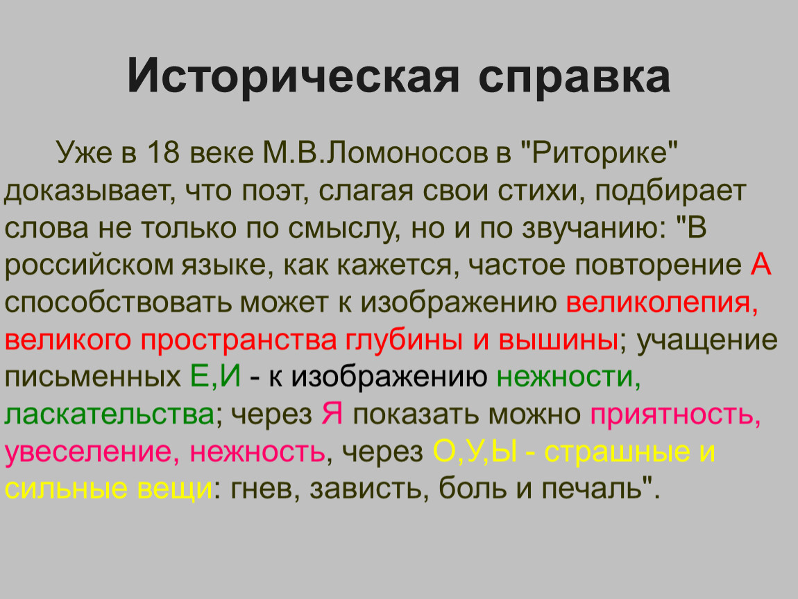 Уже в 18 веке М.В.Ломоносов в "Риторике" доказывает, что поэт, слагая свои стихи, подбирает слова не только по смыслу, но и по звучанию: "В российском языке, как кажется, частое повторение А способствовать может к изображению великолепия, великого пространства глубины и вышины; учащение письменных Е,И - к изображению нежности, ласкательства; через Я показать можно приятность, увеселение, нежность, через О,У,Ы - страшные и сильные вещи: гнев, зависть, боль и печаль".
