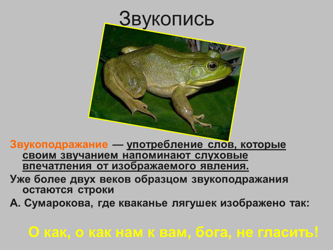 Звукоподражание — употребление слов, которые своим звучанием напоминают слуховые впечатления от изображаемого явления.