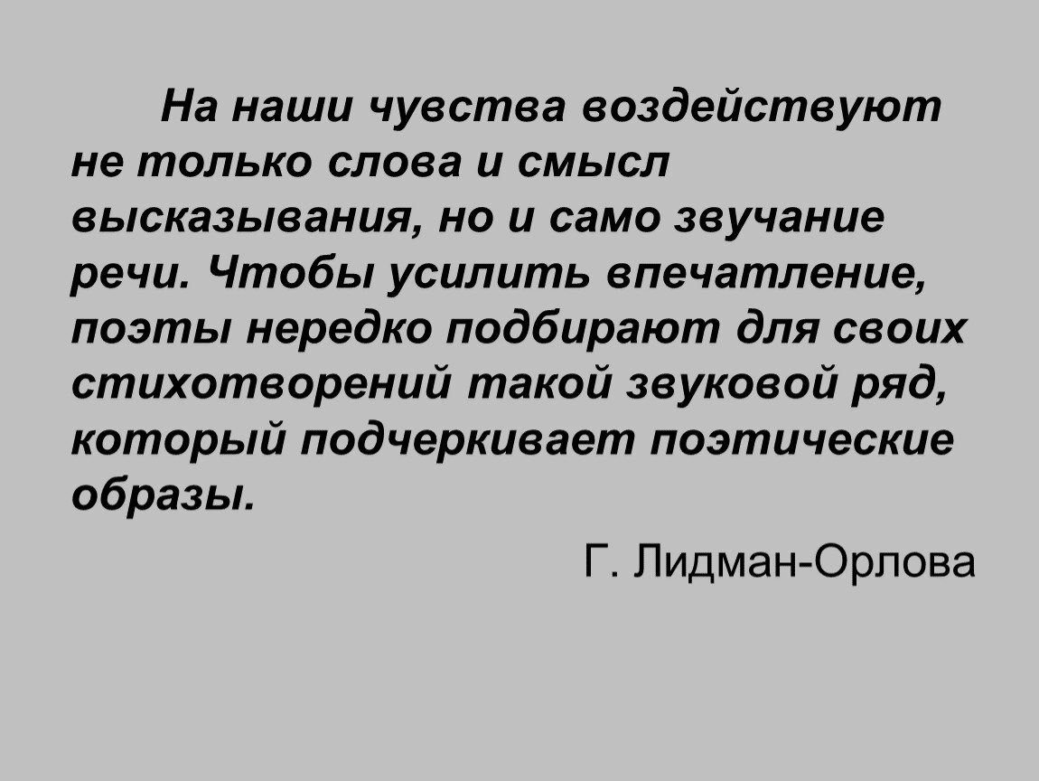 На наши чувства воздействуют не только слова и смысл высказывания, но и само звучание речи. Чтобы усилить впечатление, поэты нередко подбирают для своих стихотворений такой звуковой ряд, который подчеркивает поэтические образы.