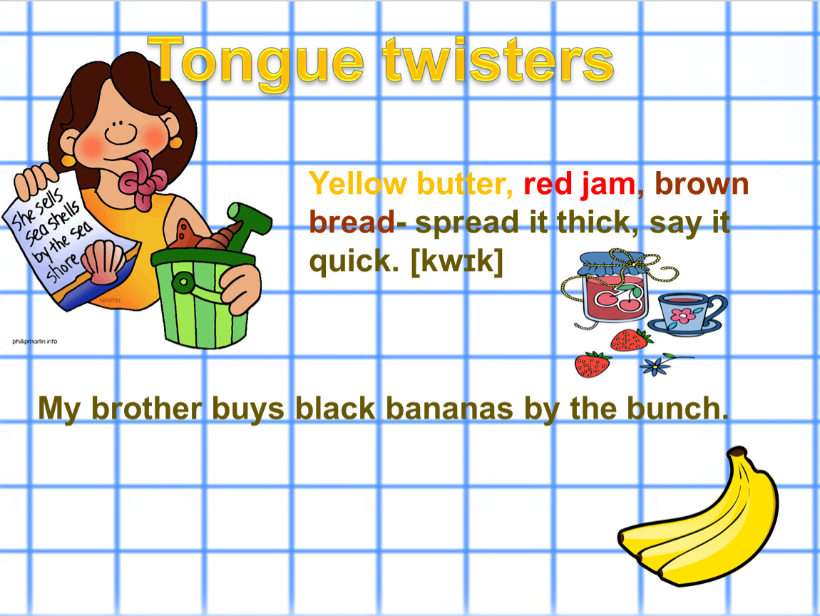 Yellow butter, red jam, brown bread- spread it thick, say it quick. [kwɪk]