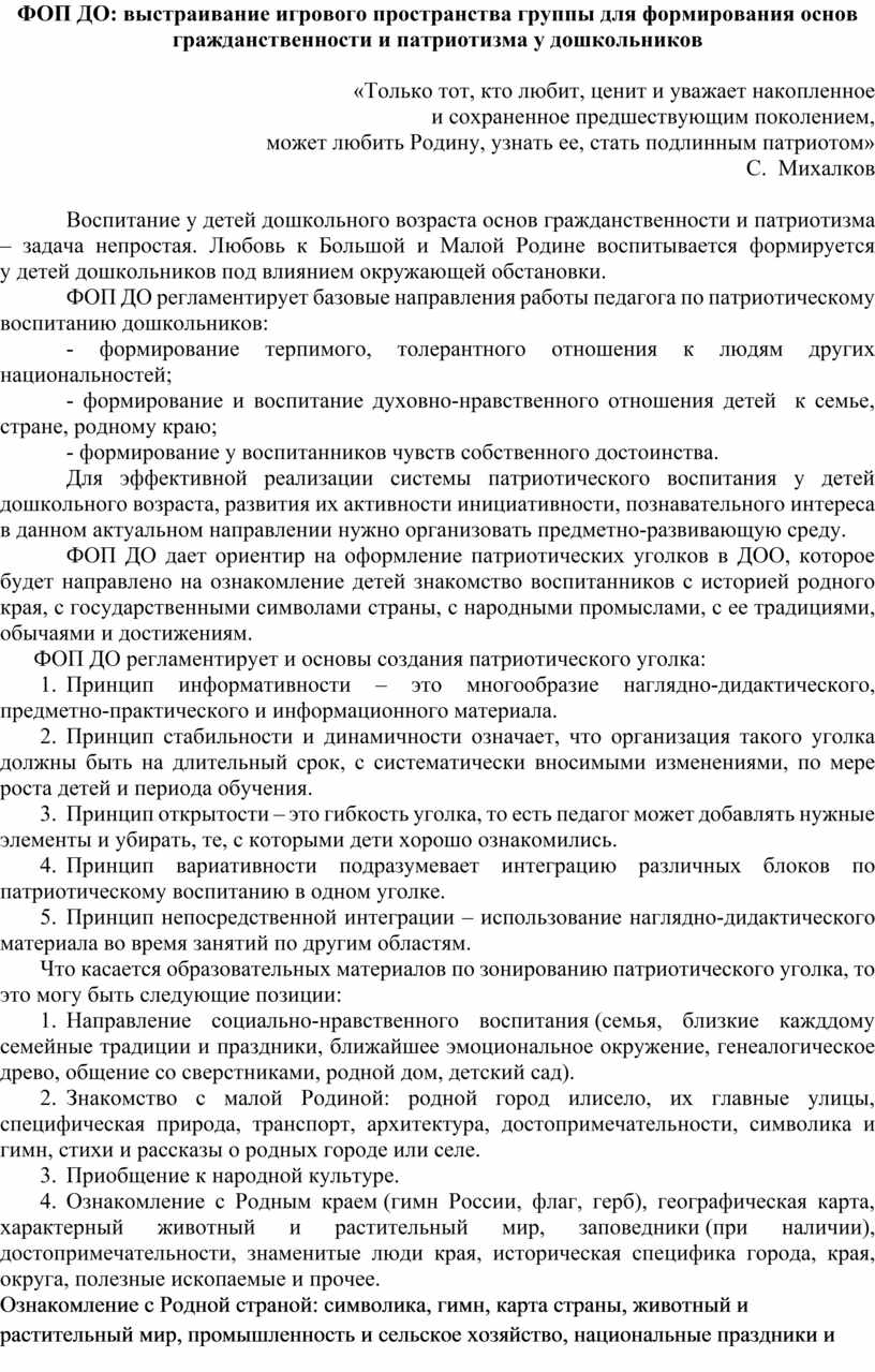 ФОП ДО: выстраивание игрового пространства группы для формирования основ гражданственности и патриотизма у дошкольников