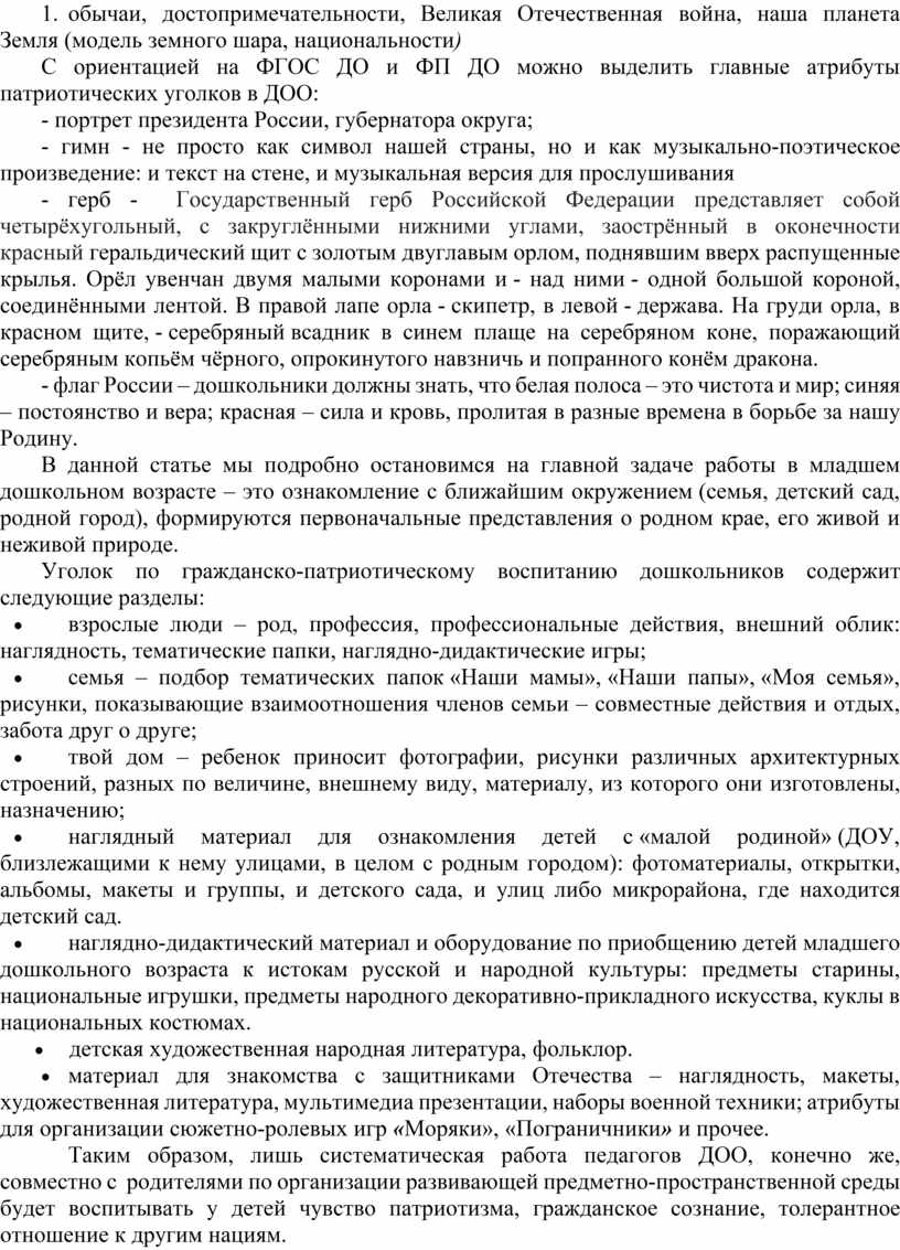 С ориентацией на ФГОС ДО и ФП ДО можно выделить главные атрибуты патриотических уголков в ДОО:
