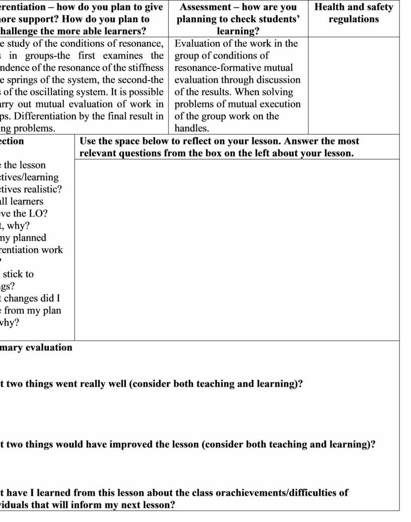Were the lesson objectives/learning objectives realistic? Did all learners achieve the LO? If not, why? Did my planned differentiation work well? Did I stick to timings? What changes did I make from my plan and why?