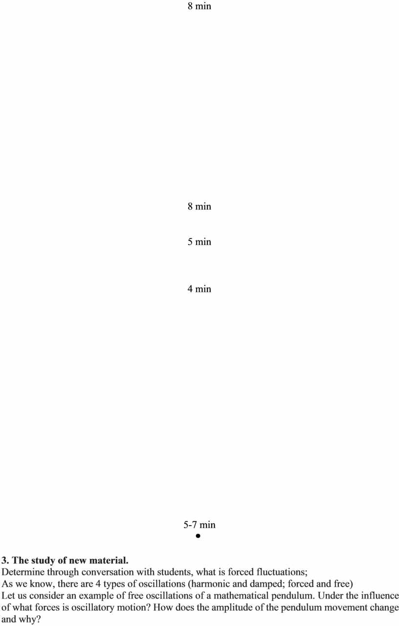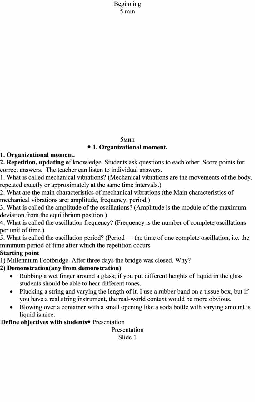 1. Organizational moment. 2. Repetition, updating of knowledge. Students ask questions to each other. Score points for correct answers. The teacher can listen to individual answers. 1. What is called mechanical vibrations? (Mechanical vibrations are the movements of the body, repeated exactly or approximately at the same time intervals.) 2. What are the main characteristics of mechanical vibrations (the Main characteristics of mechanical vibrations are: amplitude, frequency, period.) 3. What is called the amplitude of the oscillations? (Amplitude is the module of the maximum deviation from the equilibrium position.) 4. What is called the oscillation frequency? (Frequency is the number of complete oscillations per unit of time.) 5. What is called the oscillation period? (Period — the time of one complete oscillation, i.e. the minimum period of time after which the repetition occurs Starting point 1) Millennium Footbridge. After three days the bridge was closed. Why? 2) Demonstration(any from demonstration) · Rubbing a wet finger around a glass; if you put different heights of liquid in the glass students should be able to hear different tones. · Plucking a string and varying the length of it. I use a rubber band on a tissue box, but if you have a real string instrument, the real-world context would be more obvious. · Blowing over a container with a small opening like a soda bottle with varying amount is liquid is nice. Define objectives with students |