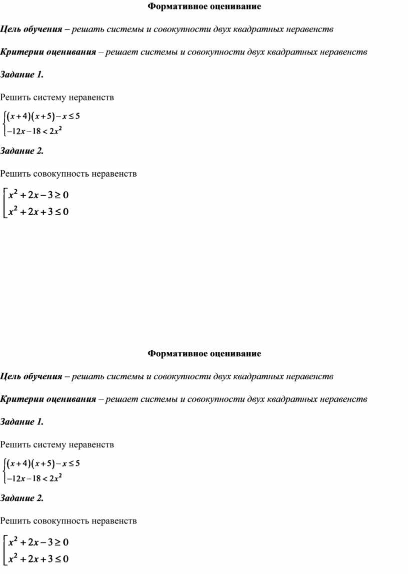 Критерии оценивания – решает системы и совокупности двух квадратных неравенств