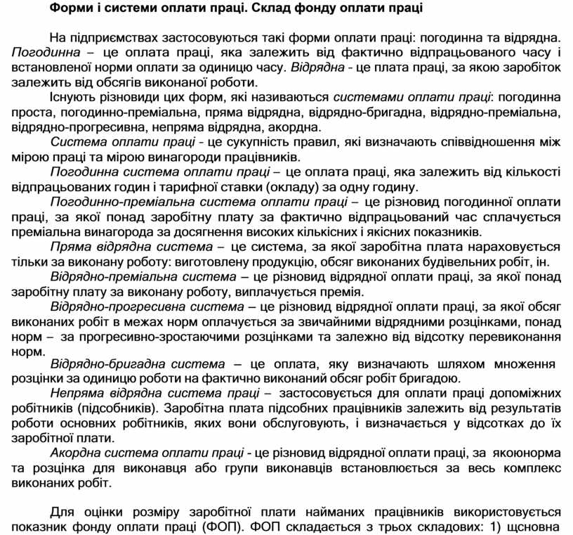 На підприємствах застосовуються такі форми оплати праці: погодинна та відрядна. Погодинна – це оплата праці, яка залежить від фактично відпрацьованого часу і встановленої норми оплати за одиницю часу. Відрядна – це плата праці, за якою заробіток залежить від обсягів виконаної роботи.