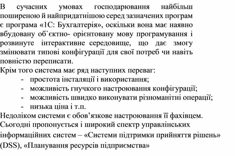 В сучасних умовах господарювання найбільш поширеною й найпридатнішою серед зазначених програм є програма «1С: Бухгалтерія», оскільки вона має наявно вбудовану об`єктно- орієнтовану мову програмування і розвинуте інтерактивне середовище, що дає змогу змінювати типові конфігурації для свої потреб чи навіть повністю переписати.
