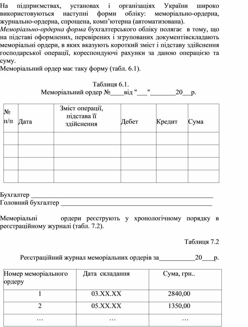 Меморіальні ордери реєструють у хронологічному порядку в реєстраційному журналі (табл. 7.2).