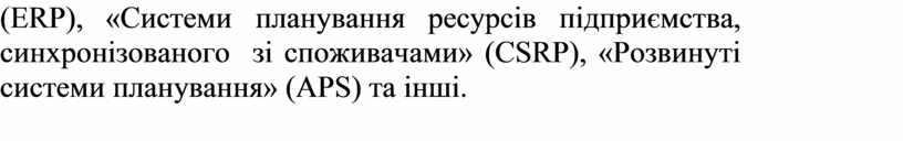 Сьогодні пропонується і широкий спектр управлінських інформаційних систем – «Системи підтримки прийняття рішень» (DSS), «Планування ресурсів підприємства» (ERP), «Системи планування ресурсів підприємства, синхронізованого зі споживачами» (CSRP), «Розвинуті системи планування» (APS) та інші.
