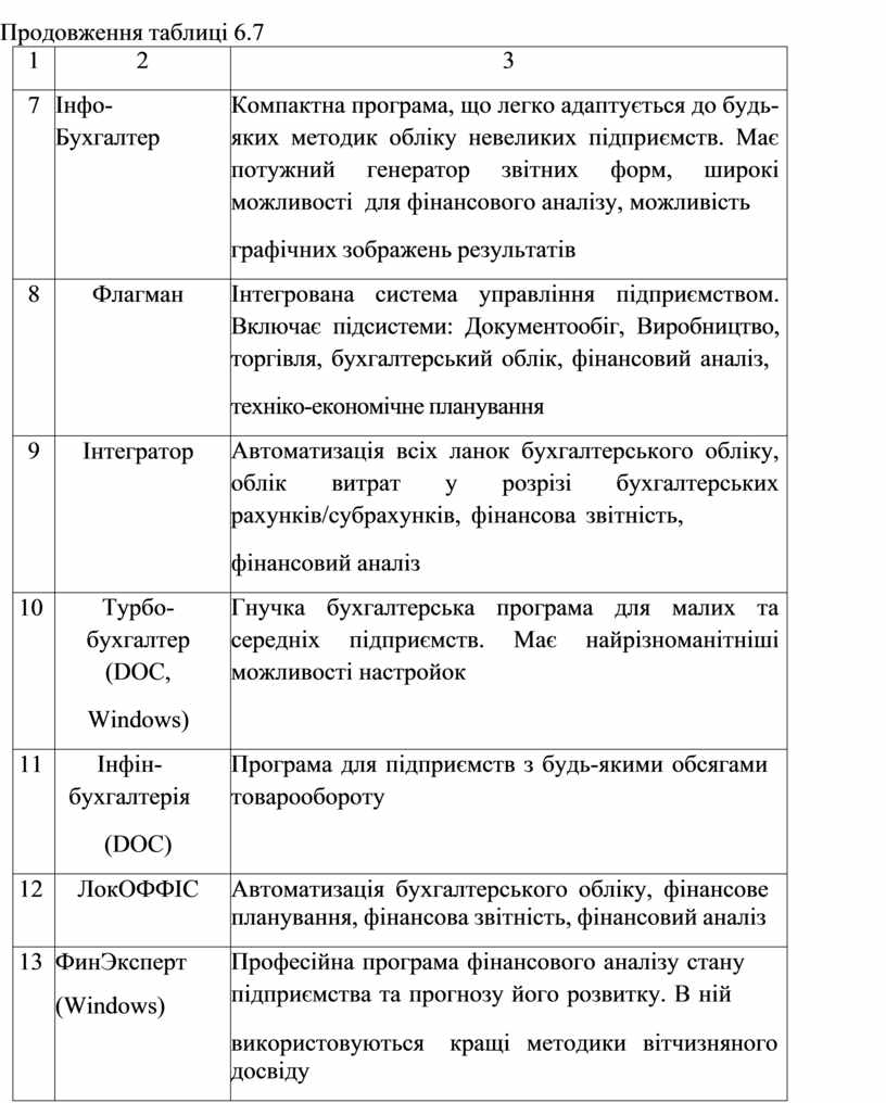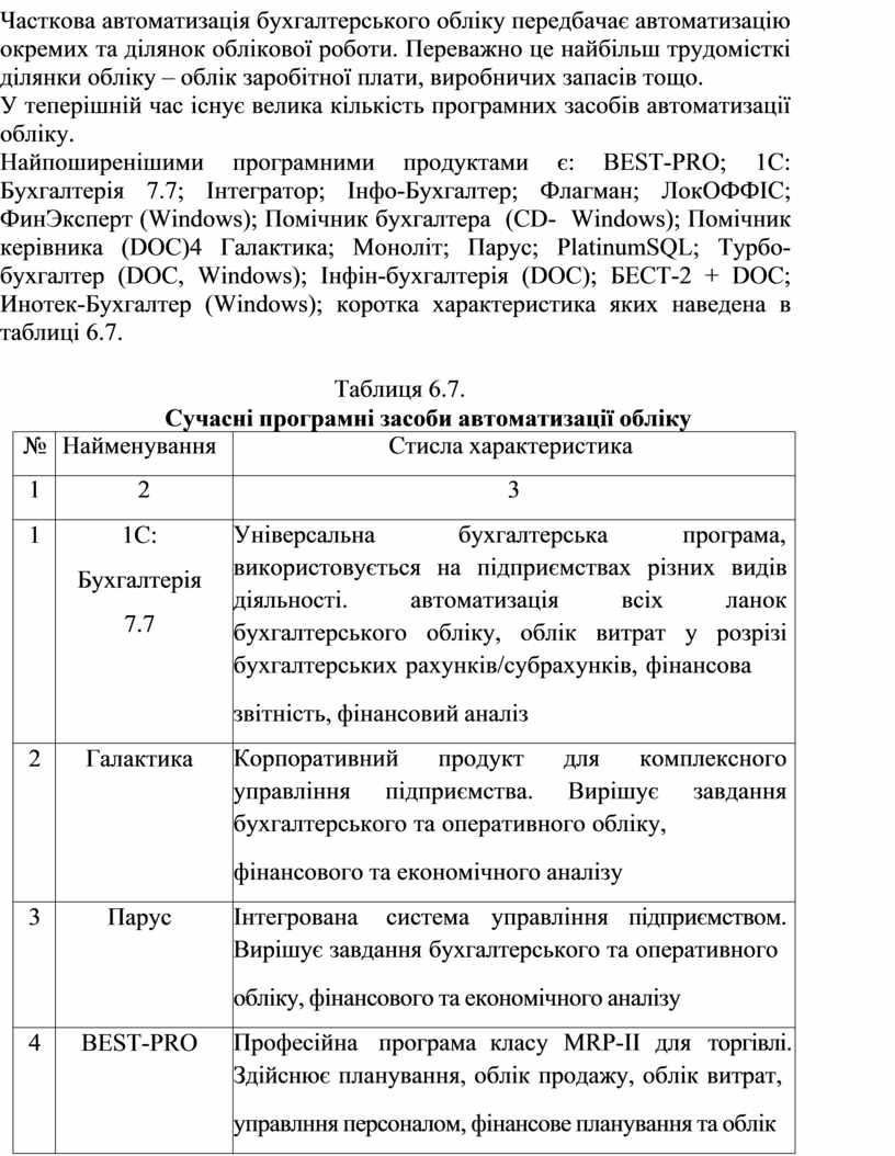 Найпоширенішими програмними продуктами є: BEST-PRO; 1С: Бухгалтерія 7.7; Інтегратор; Інфо-Бухгалтер; Флагман; ЛокОФФІС; ФинЭксперт (Windows); Помічник бухгалтера (CD- Windows); Помічник керівника (DOC)4 Галактика; Моноліт; Парус; PlatinumSQL; Турбо-бухгалтер (DOC, Windows); Інфін-бухгалтерія (DOC); БЕСТ-2 + DOC; Инотек-Бухгалтер (Windows); коротка характеристика яких наведена в таблиці 6.7.