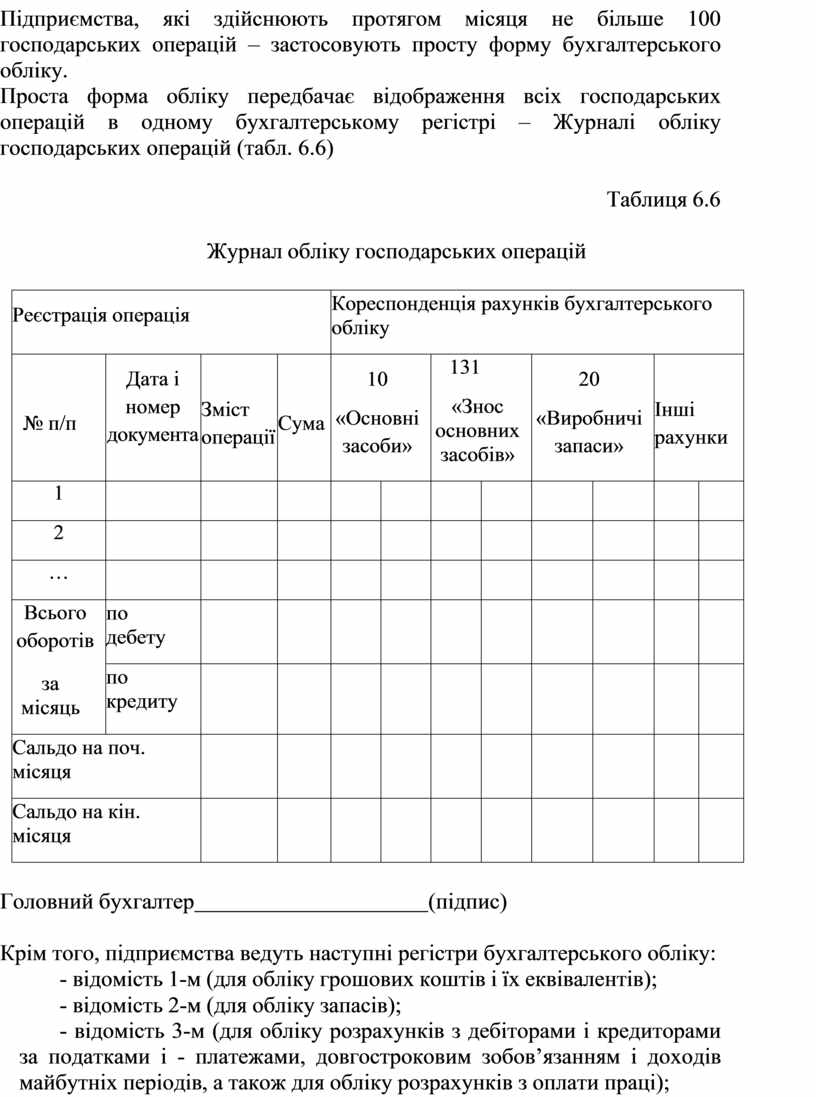 Проста форма обліку передбачає відображення всіх господарських операцій в одному бухгалтерському регістрі – Журналі обліку господарських операцій (табл. 6.6)